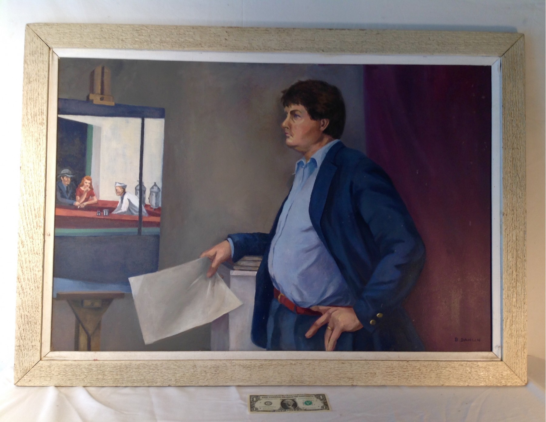 A very interesting original oil on canvas painting. Gazing at the Edward Hoppers iconic painting of the diner titled Night Hawks. This painting is by the late local Connecticut artist Barbara Dahlin.