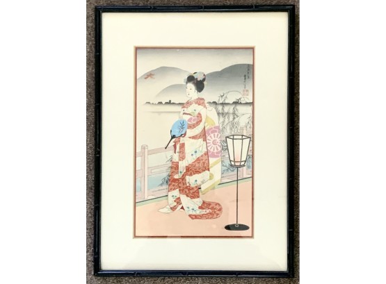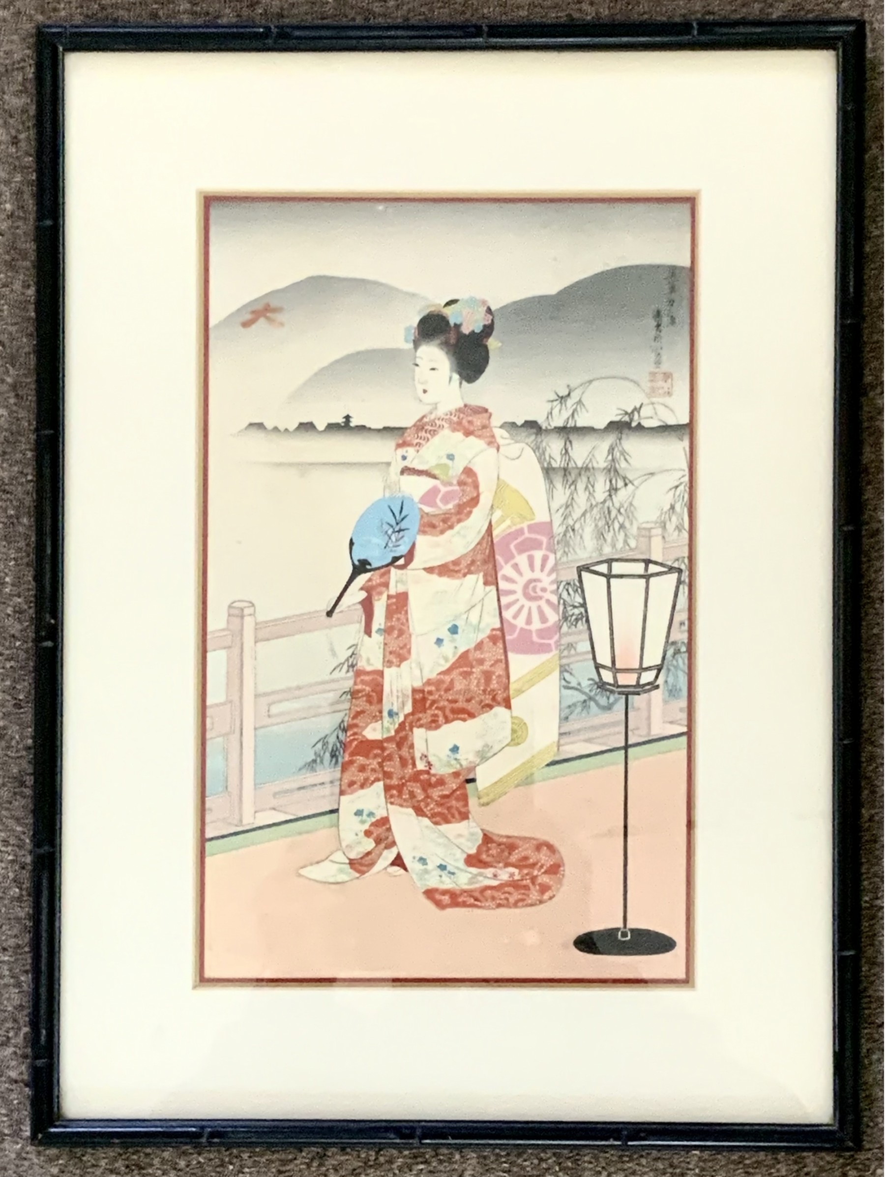 This print has good color and clarity. This artist is very well known Sadanobu Hasegawa. Specializes in geisha & courtesan . There is a small 3” crease in upper right side. Also signed upper right.