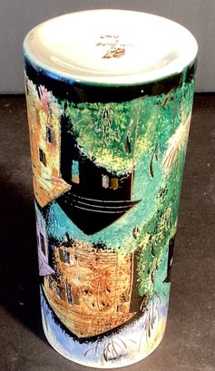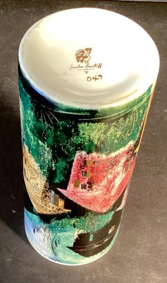 * His work is known for bright colors and 24 karat gold details. The number 049 on the bottom of this vase is the mold/pattern number for this item which is known as the ‘Rooftop’ series.