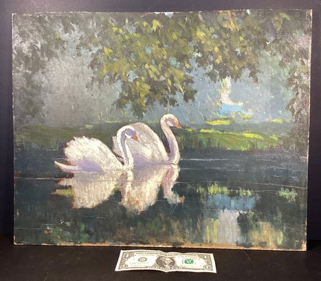 Have a very nice oil painting of two swans, gliding on a pond. This painting was created by the late Saxton Burr, who was an artist from Old Lyme.