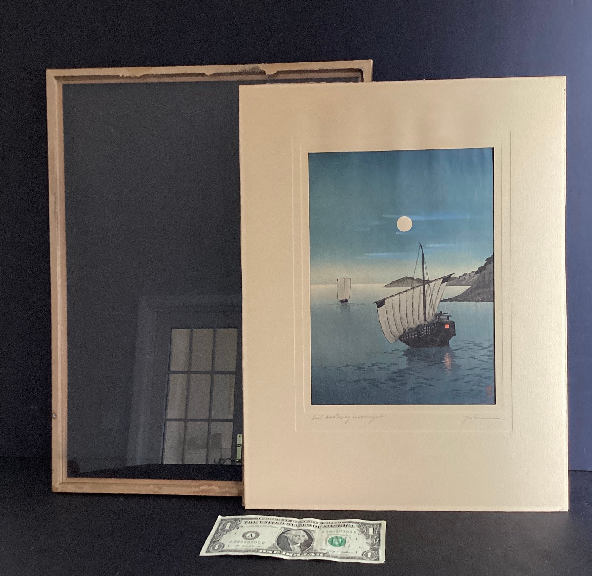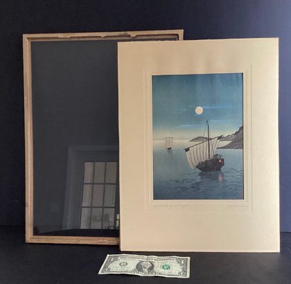 The lithograph itself is beautifully done with two Asian boats, one is at the forefront with a sale at half mast. The other is by the horizon, both bathed under moonlight.