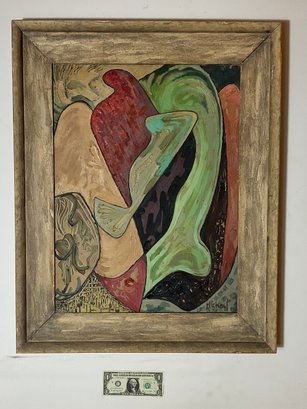 This painting has the original frame and probably should be cleaned a little soap and water would go along way. There is some paint flaking and a couple of areas. Nothing major. The painting was done in the 1950s.