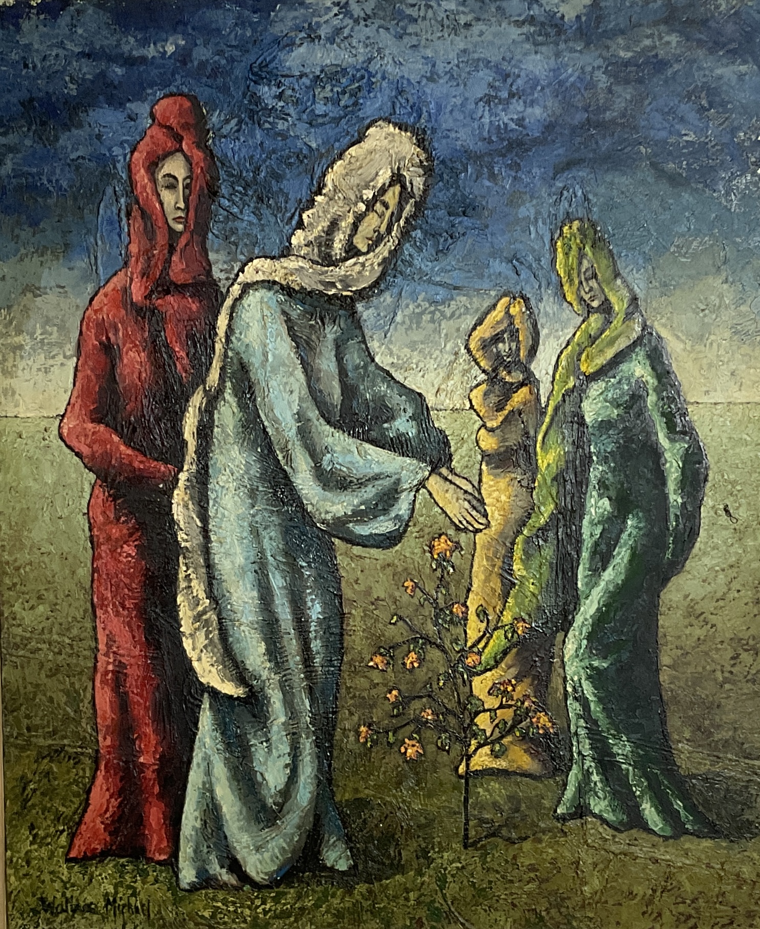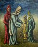 This oil painting is extremely interesting from several points. This is a very surreal scene, highlighted by the texture of the paint With the color combinations, make it a very strong image. If you focus on the faces, you’ll see this is done by an artist with a talent.