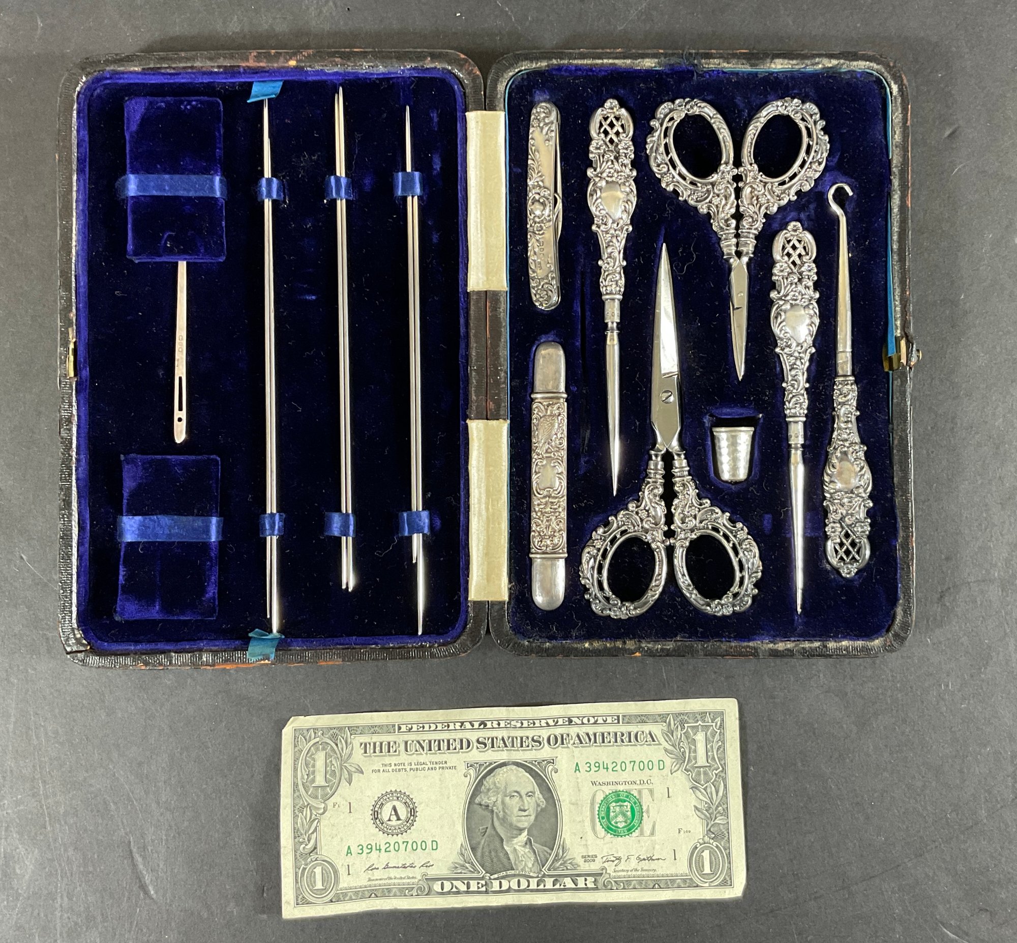 This is really a super ladies sewing kit and a leather fitted box with a velvet interior. All the pieces are hallmarked and it appears they are from Liverpool, England or at least they are from England. They are antique. They are two sizes of scissors, a knife, needle case, buttonhook, two very sharp instruments, six long needles, and one hallmark needle. All the items are in excellent condition ready to use a really super set.