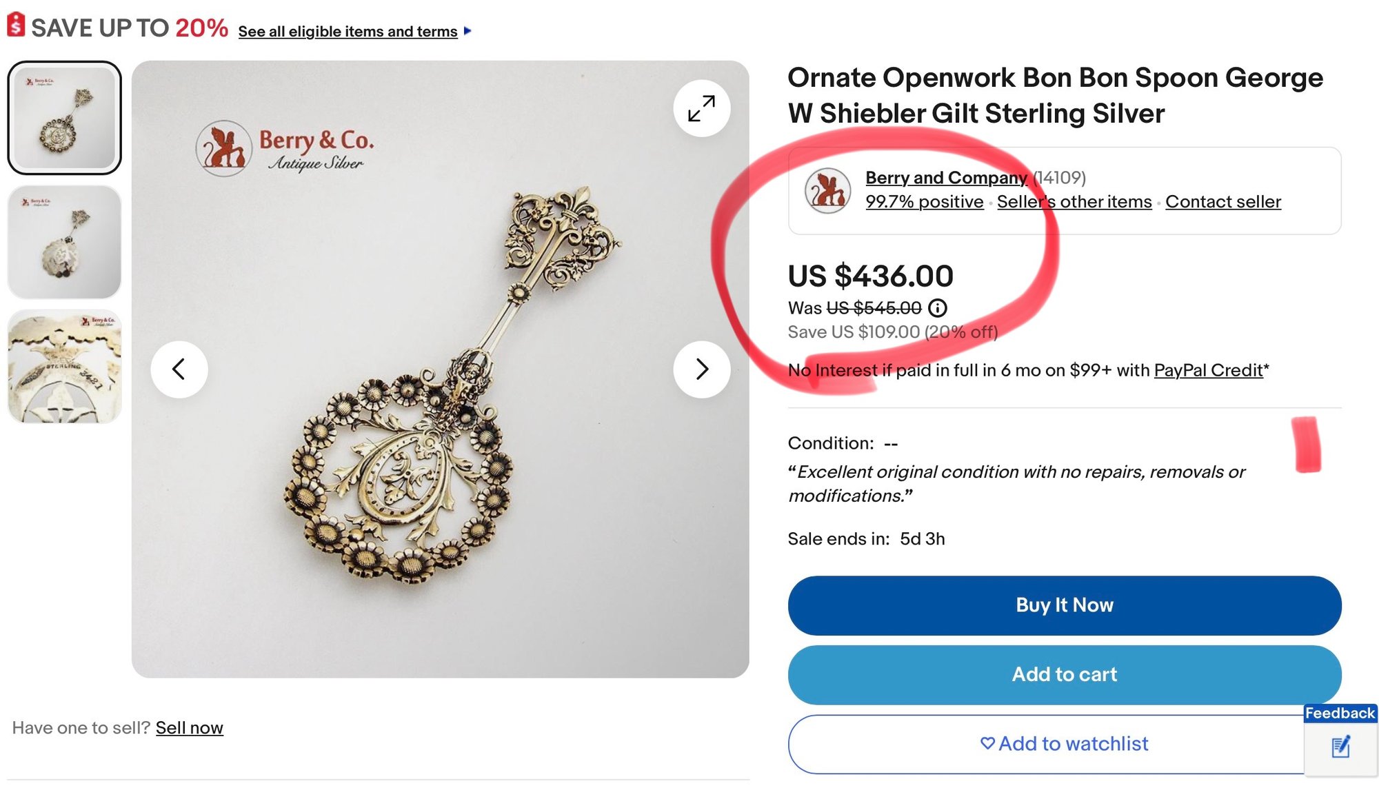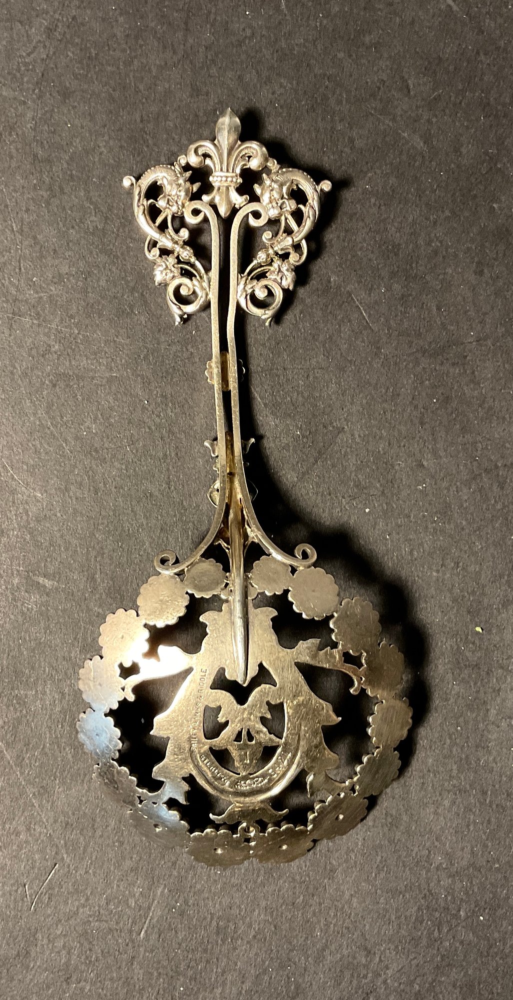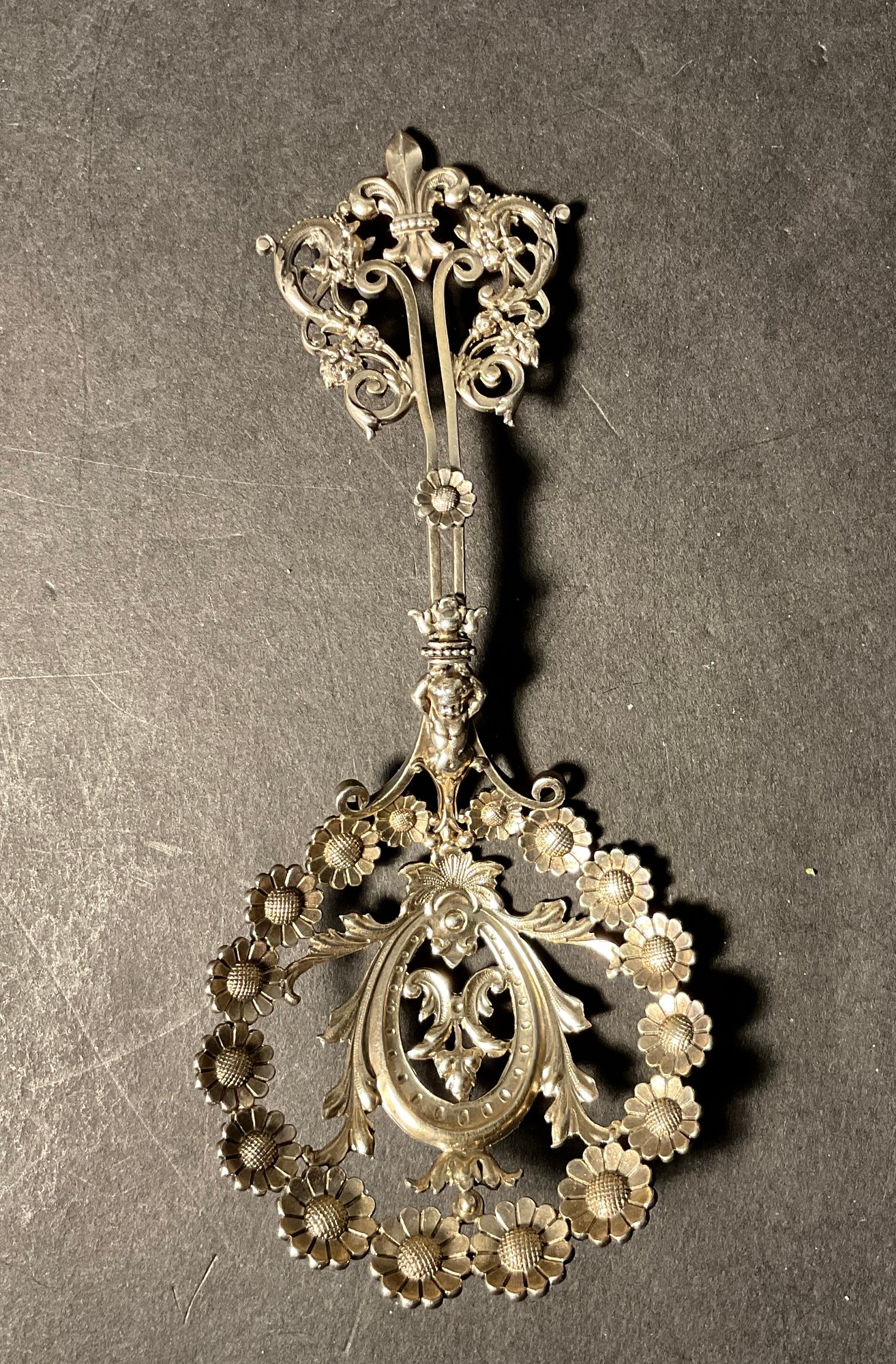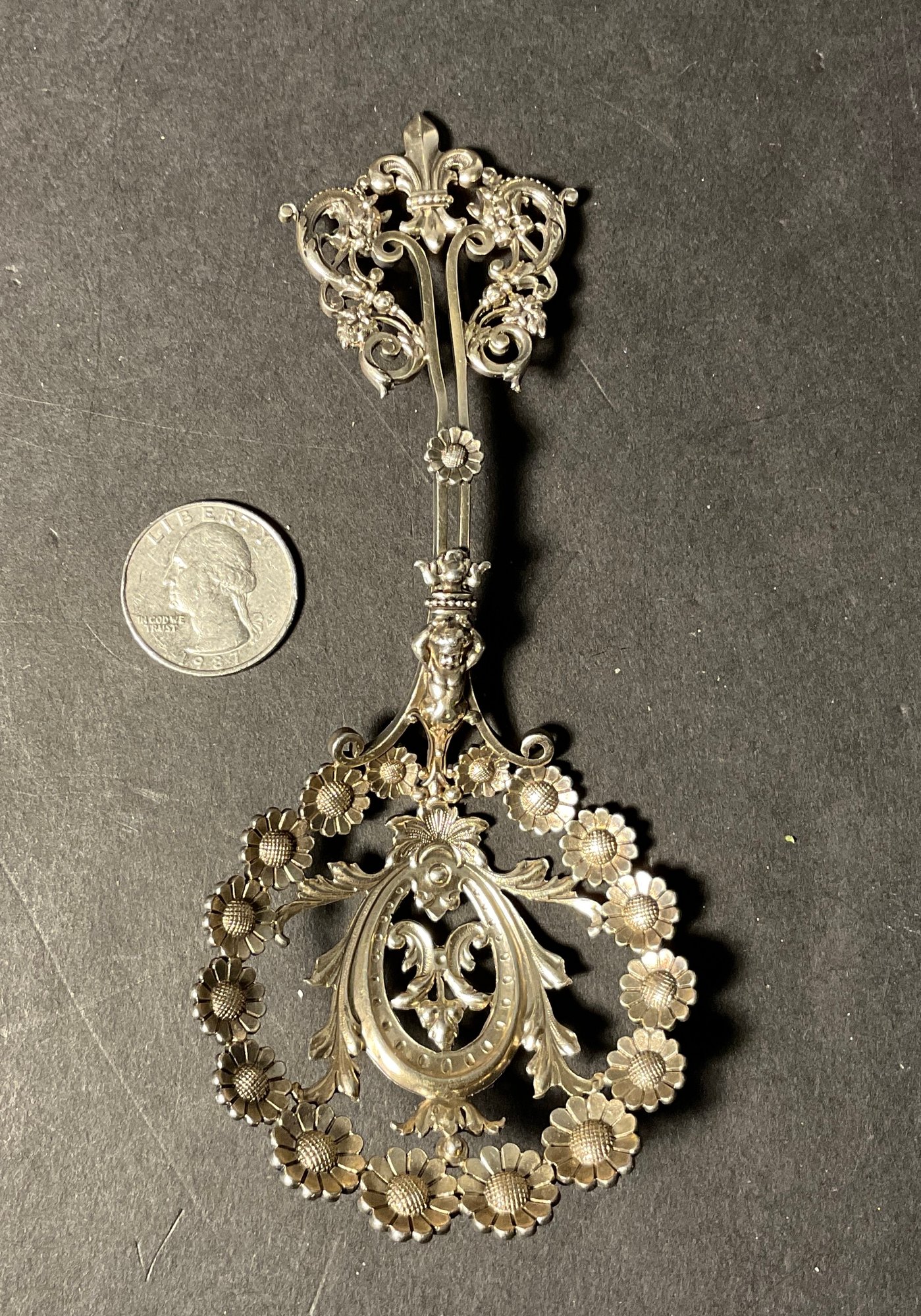 What a very unusual, bonbon spoon made by George Schieber. This spoon has sunflowers, a cherub and other decorations.