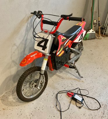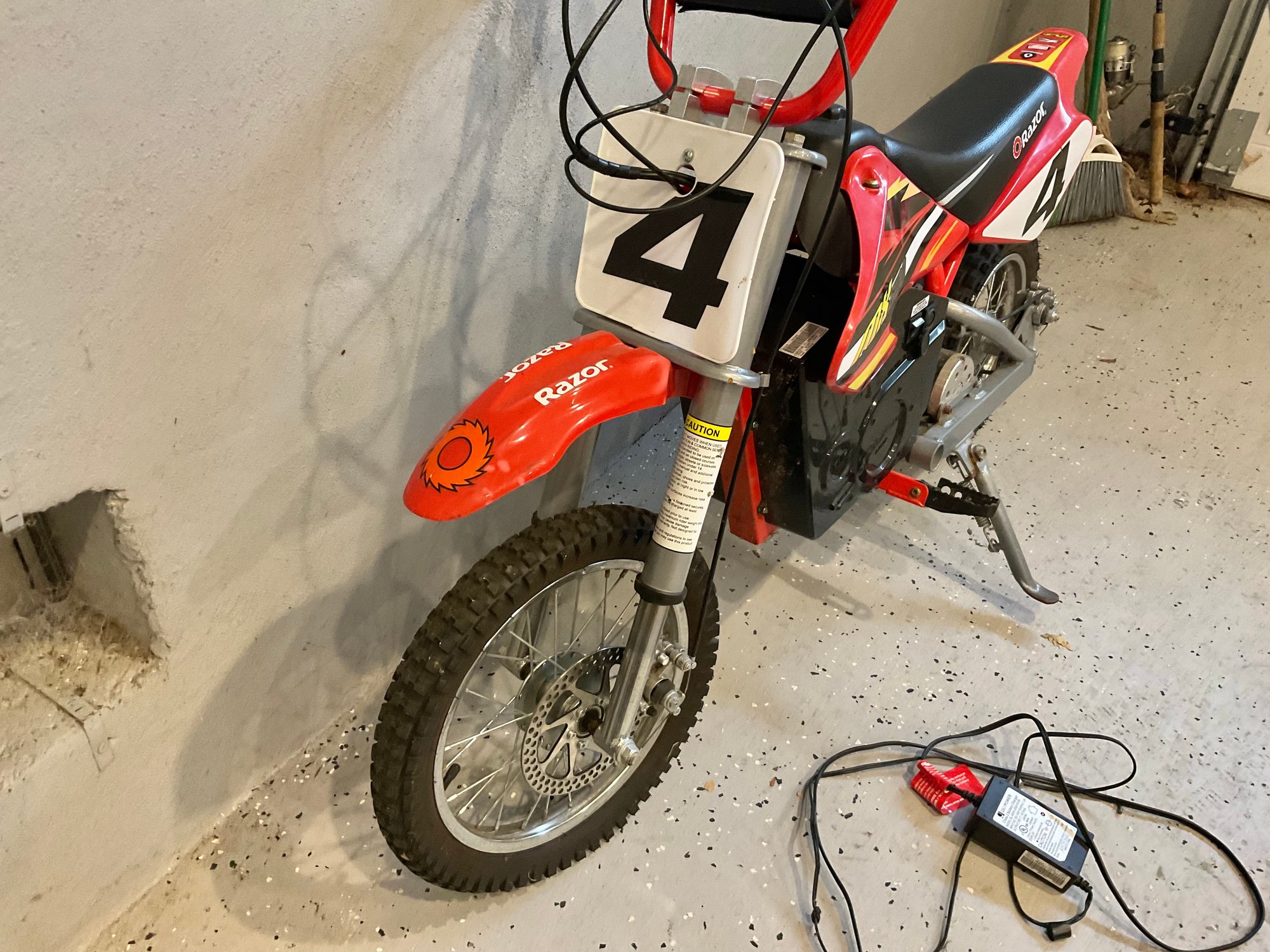 Here is a lightly used Razor 500 MX electric dirtbike great for a young boy with lots of energy. 15 mph max. This bike was not used very much as you can see similar to the others. There’s very little evidence of use mostly dust from being put in the garage. This runs very well and will give you hours upon hours of enjoyment for your young boy, or a girl.