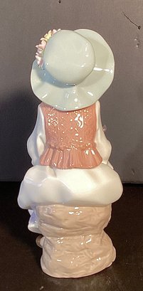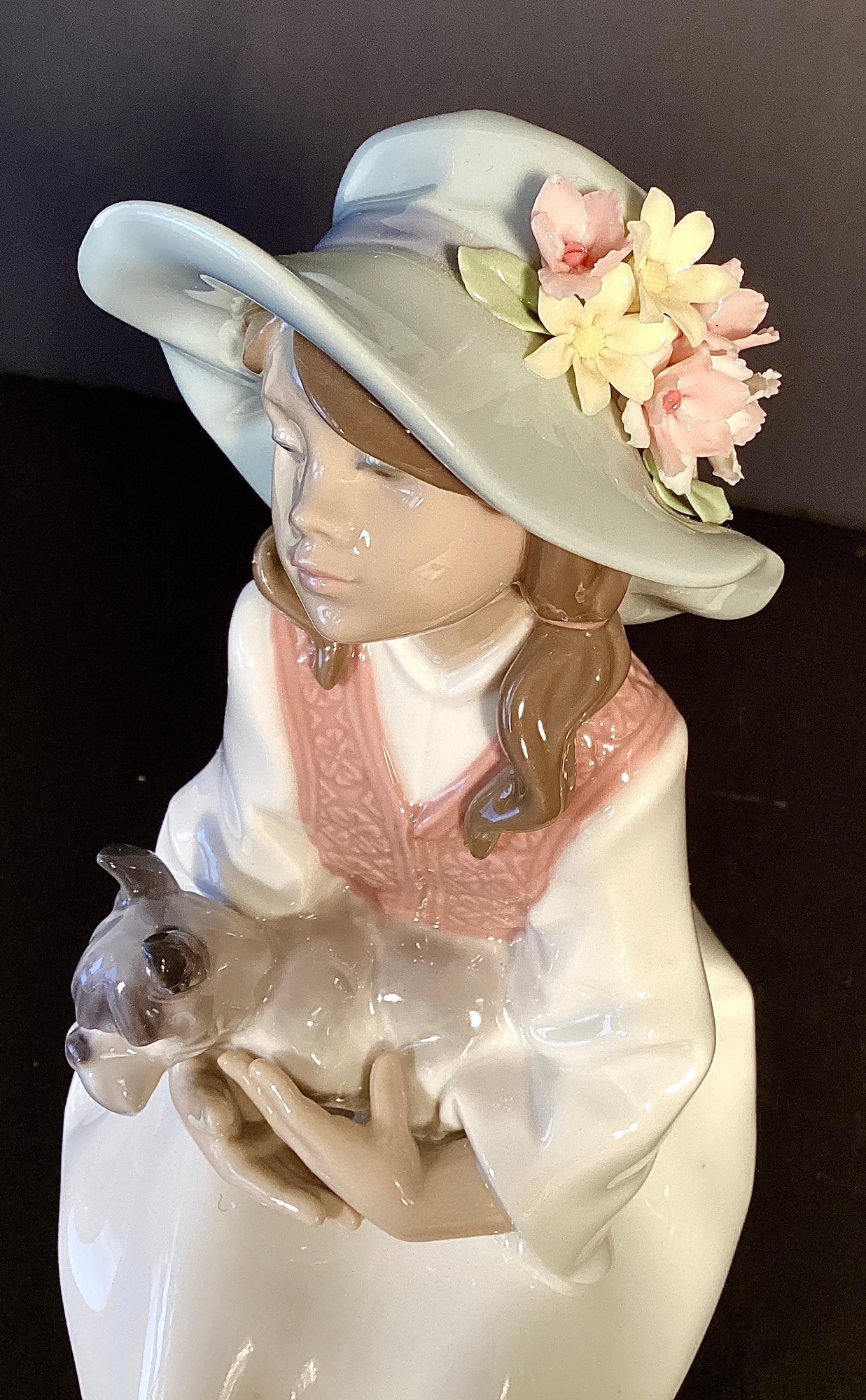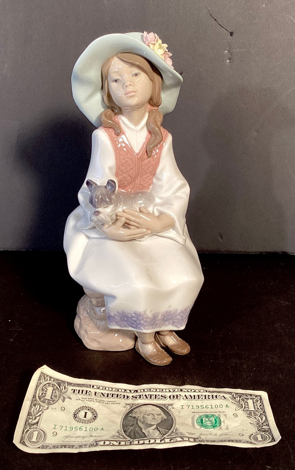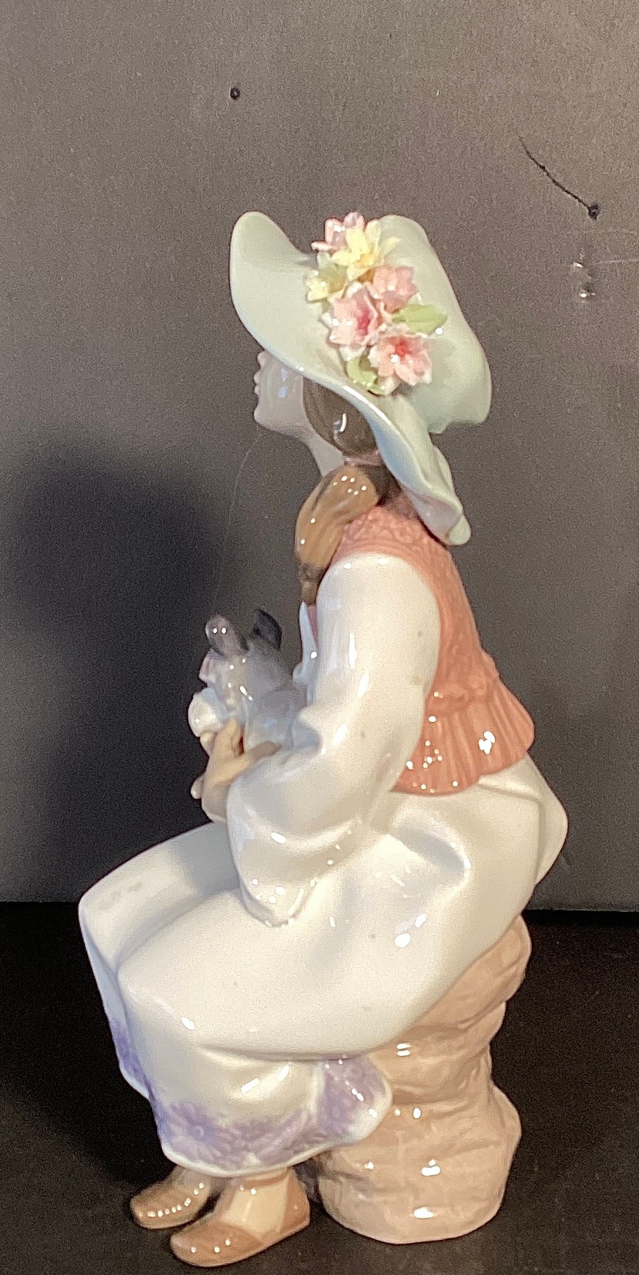 * The figurine is of a young girl holding a schnauzer who seems to be dozing. She has a pale grey hat that has beautiful flowers attached.