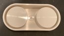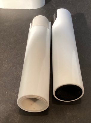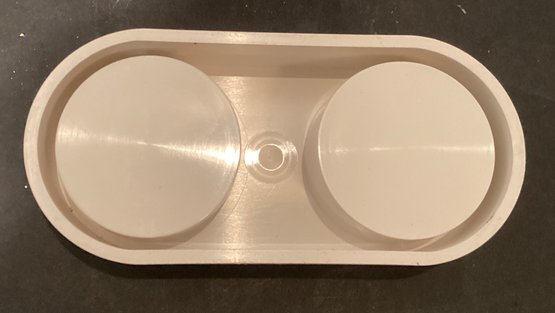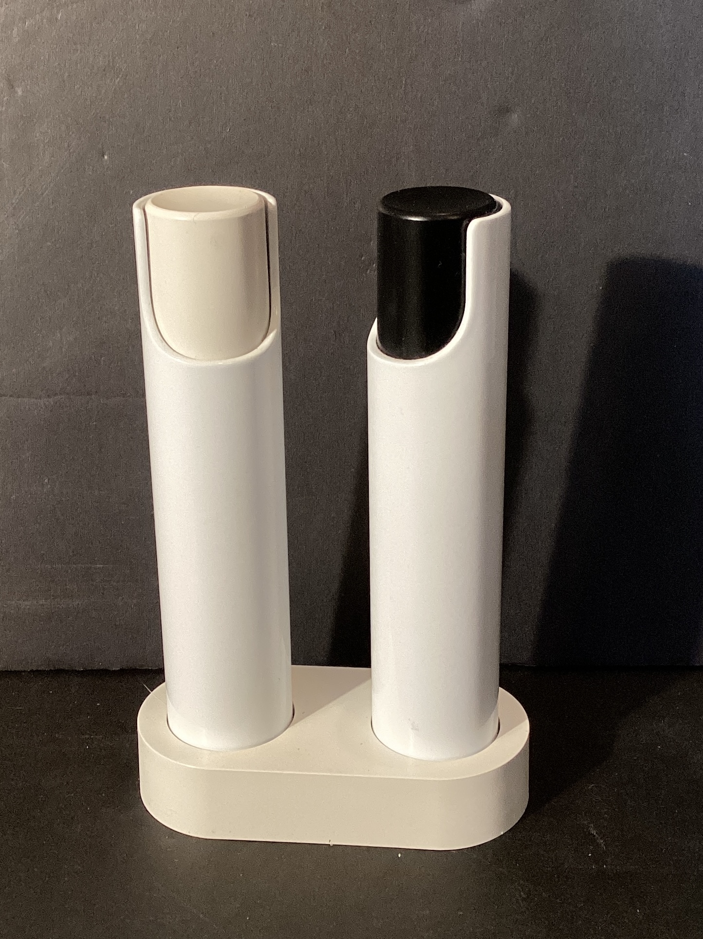 Here is a great mid century design of Rosendahl plastic salt and pepper set on holding device in white plastic.