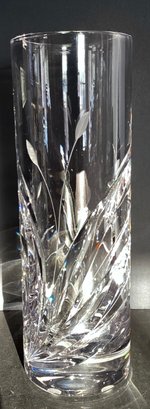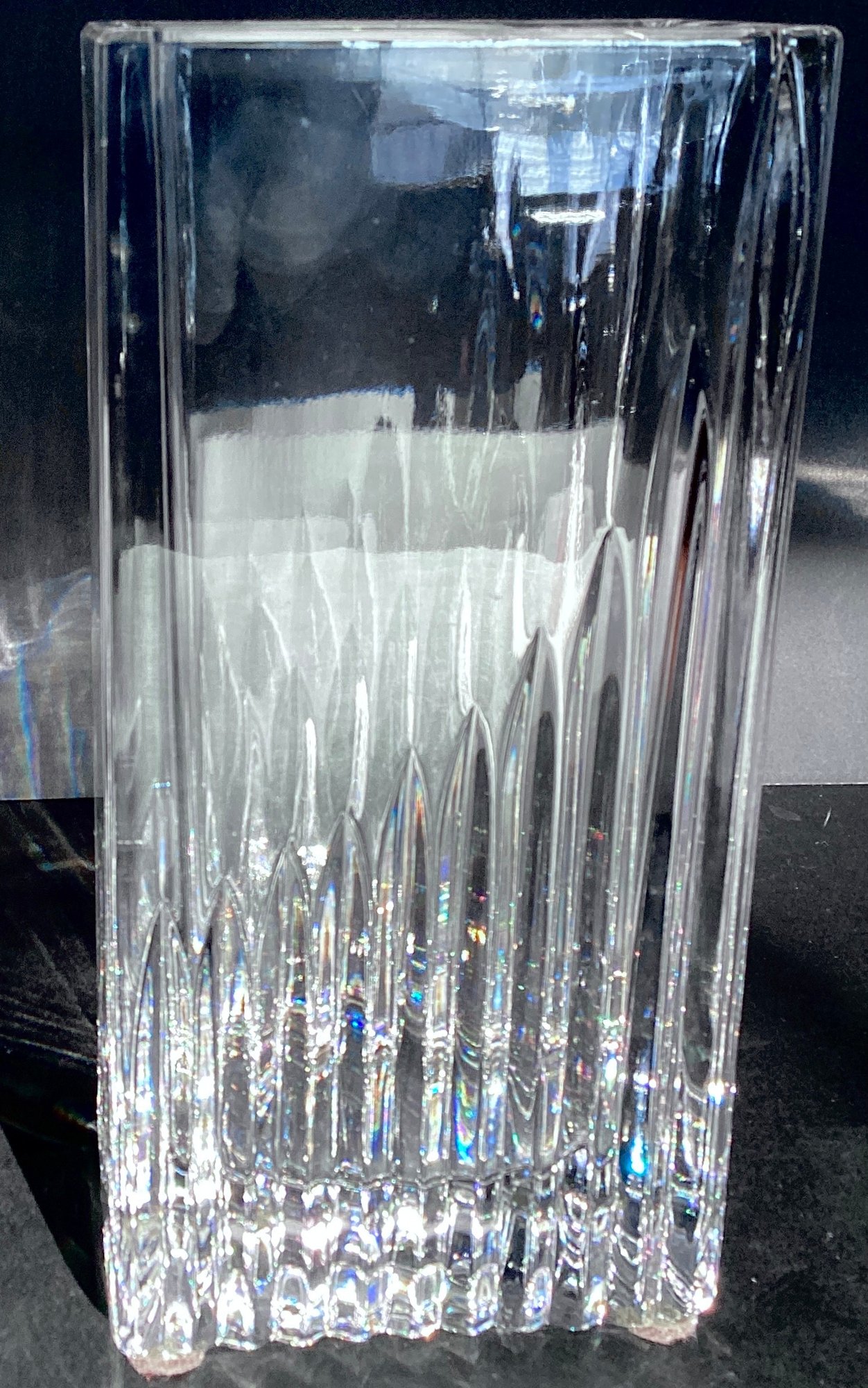 * heavy modern lead glass vase in rectangle design. 11” height x 3”. No maker located.