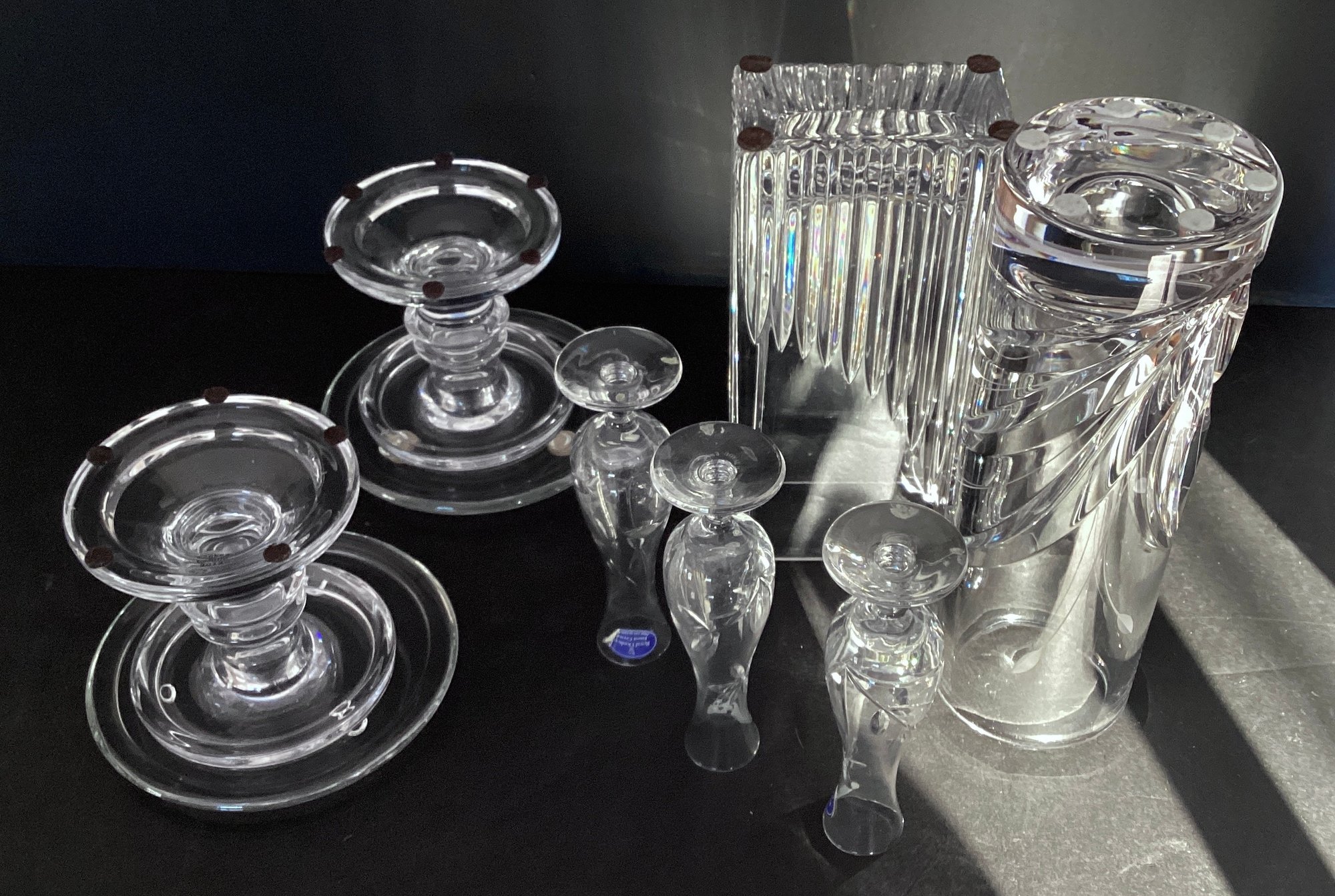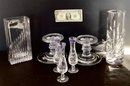 Glass vases, bud vases, and glass taper holders.