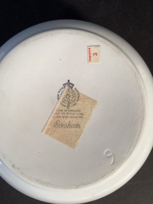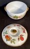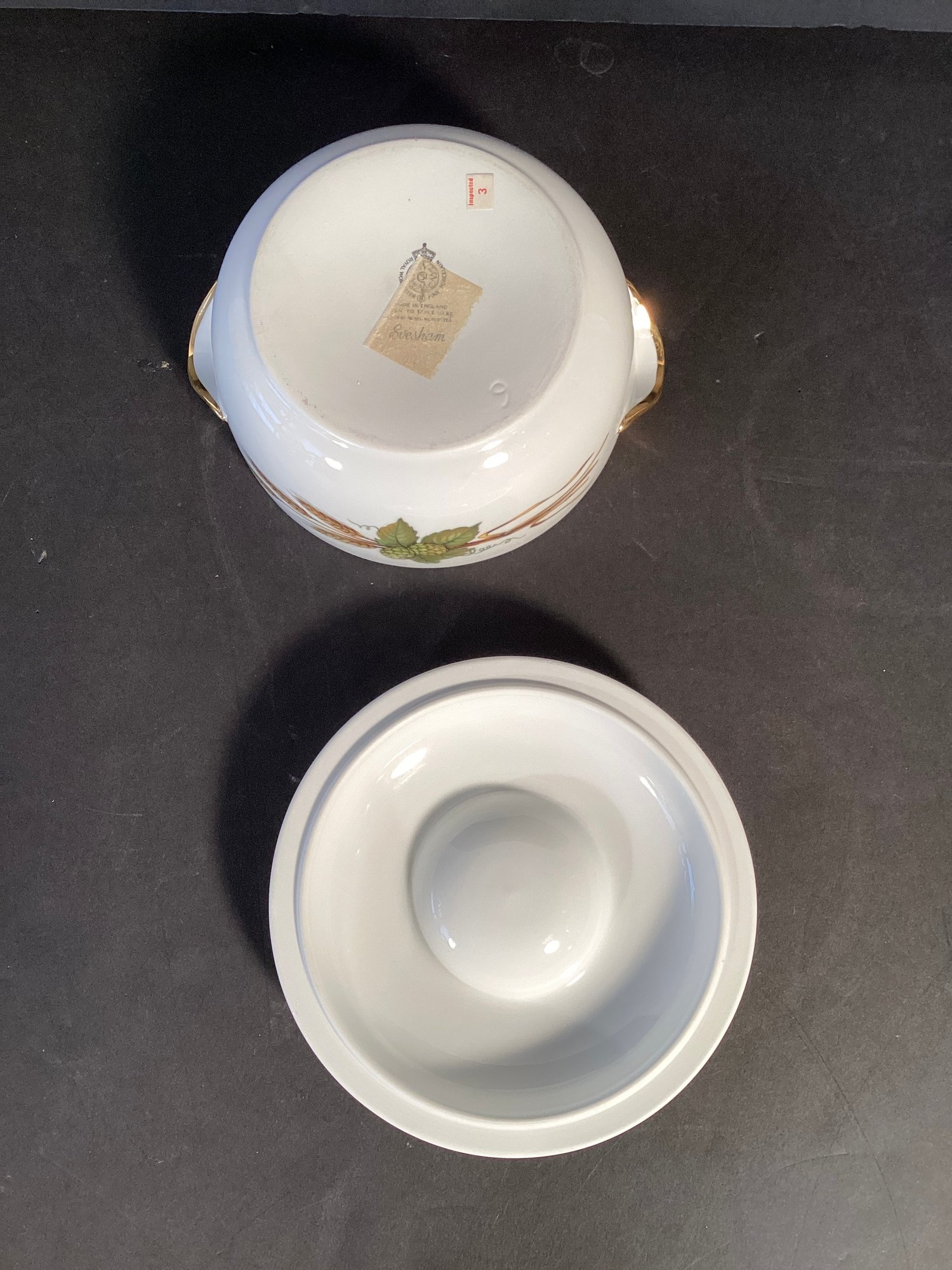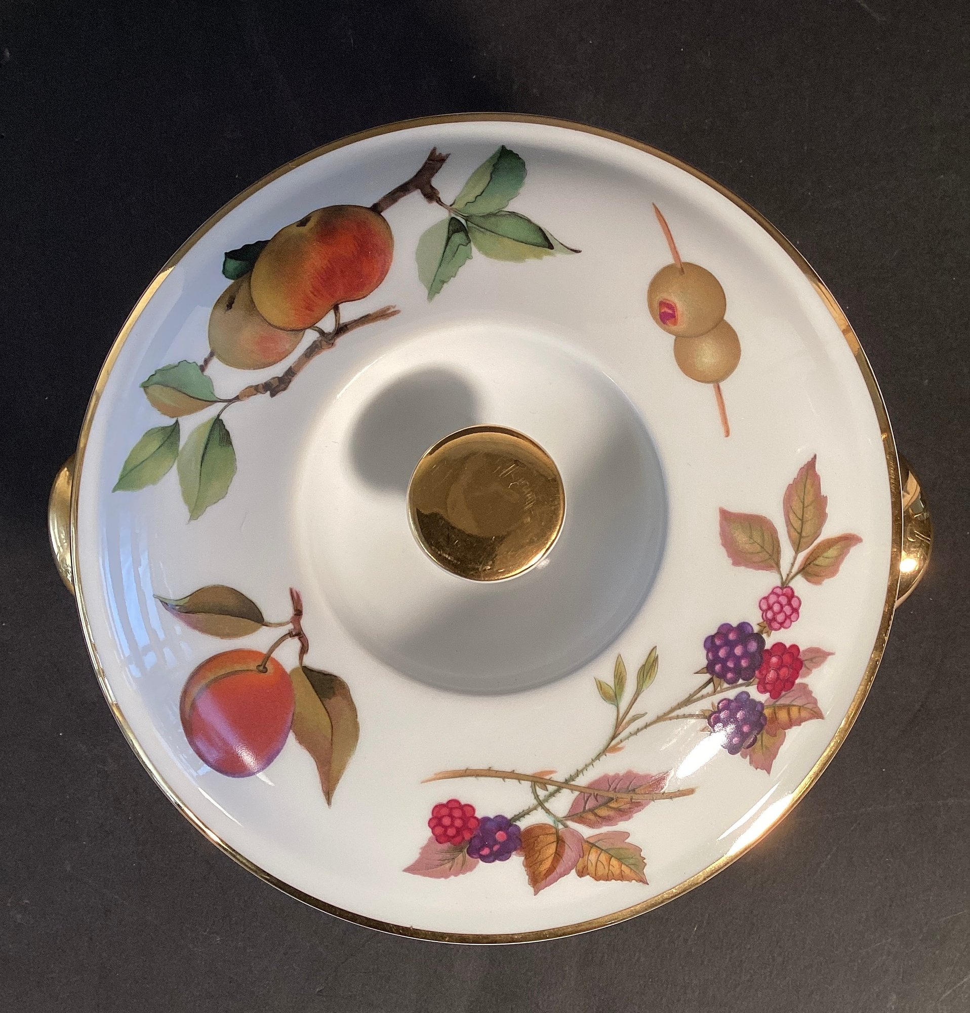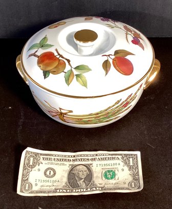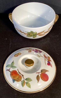 * The EVERSHAM pattern has gilded edging around the lid the top handle, and also the two handles on the actual dish. The design on this casserole dish shows asparagus, wheat, apples, plums, berries, and olives.