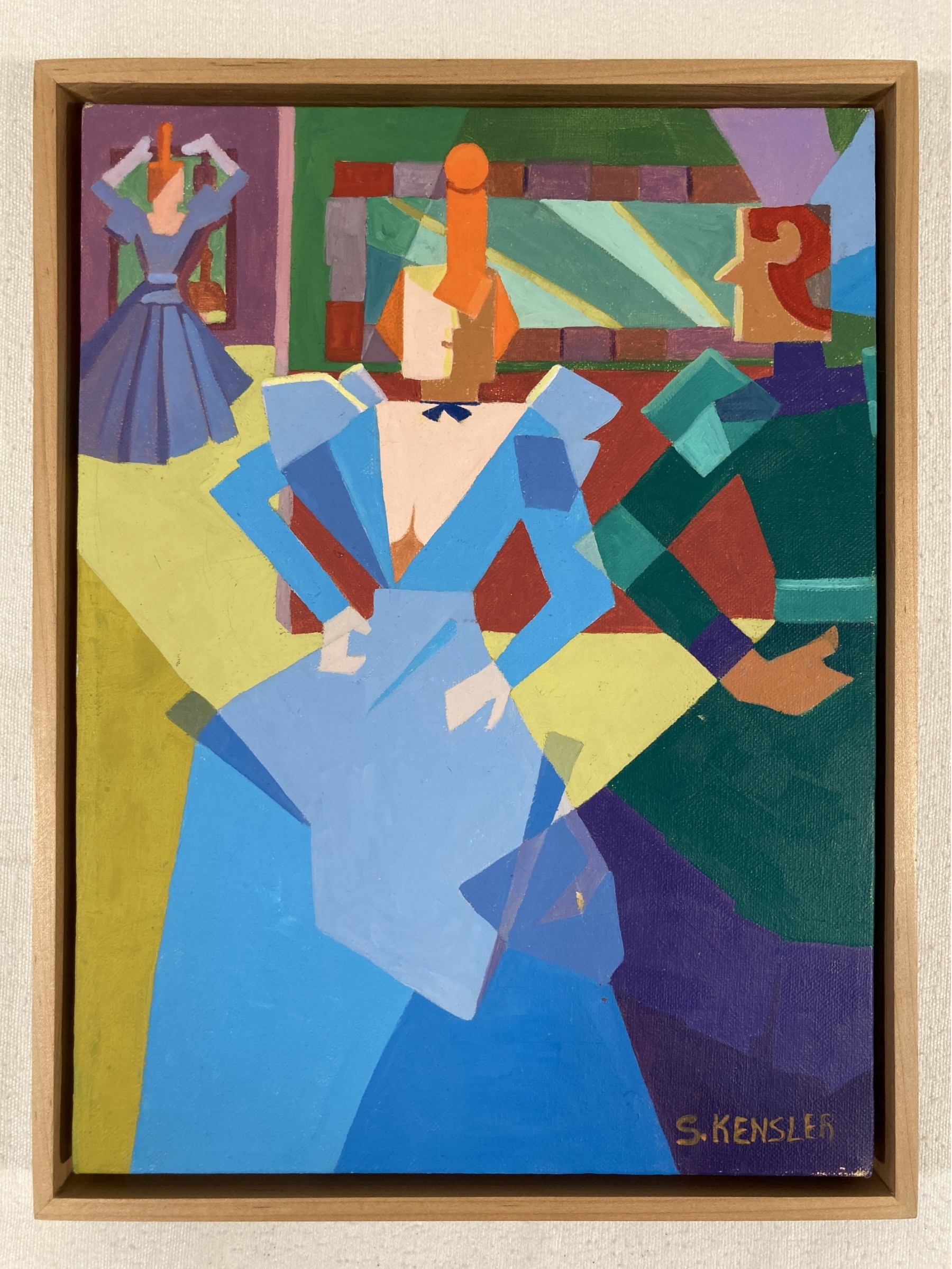 Selling an original S. Kensler abstract oil painting on canvas featuring three female in dresses. Signed lower right.
