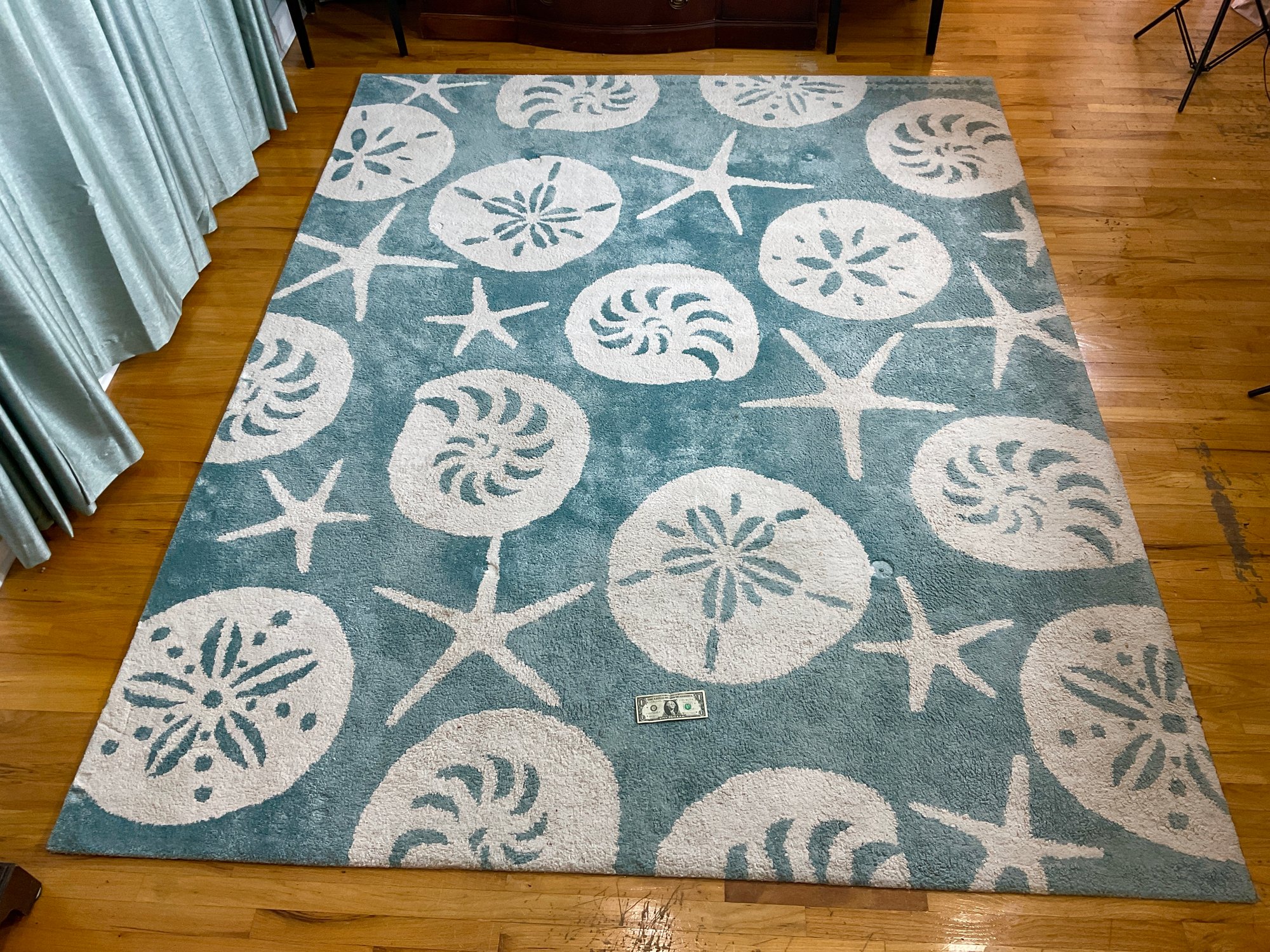 Here we have a very attractive area rug for your home. This carpet has a repeating pattern of sand and starfish that are white against an aqua blue background. The carpet will give a summer vibe to your home and will be a great addition.