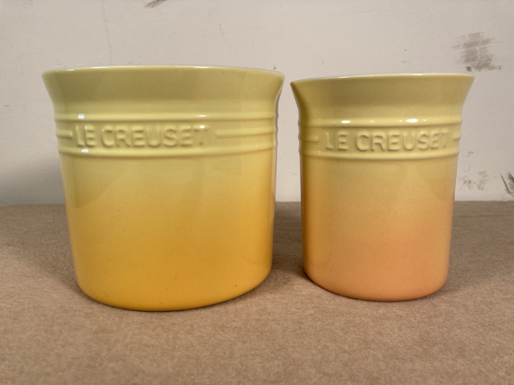 Selling a very nice set of 2 Le Creuset stoneware utencil crocks or jars in a Dijon yellow color, yellow to orange gradient. Both measure 6” in Height. One crock is 1 Qt and 2.5 Qt. Lot B