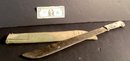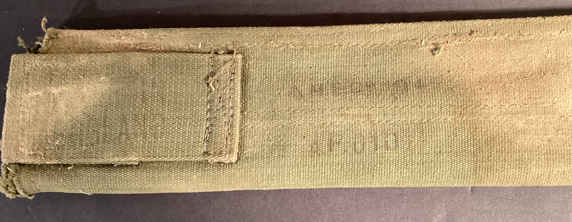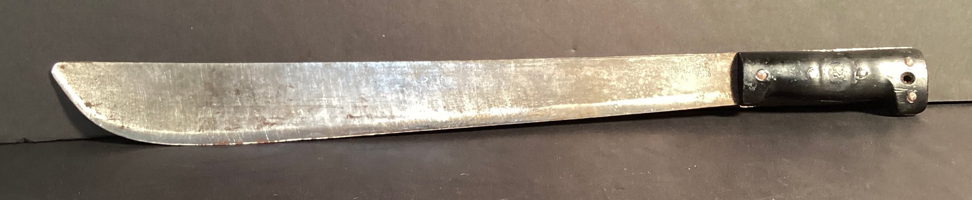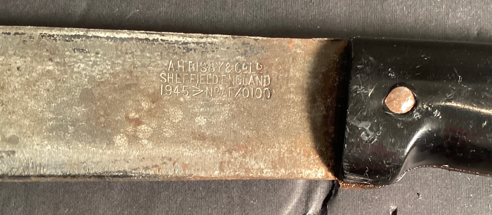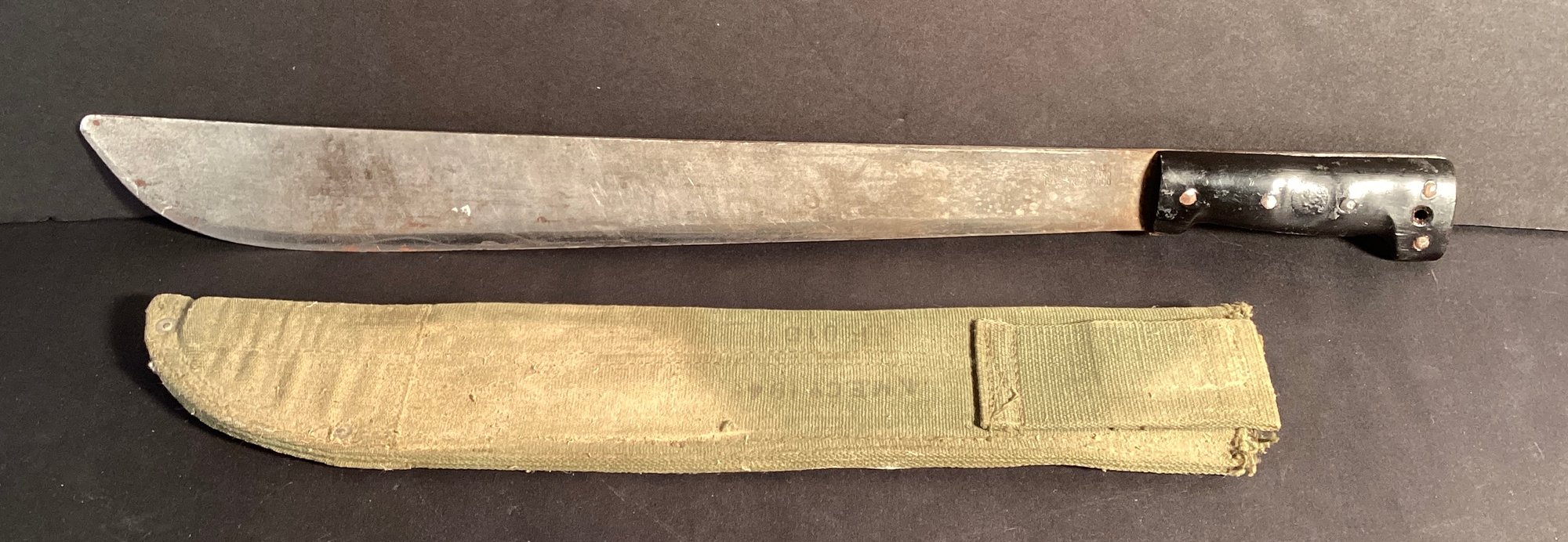 Here we have a World War II machete with a canvas sheath.by H. S. Bisby from Sheffield, England 1945 No. AF/0100.