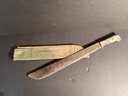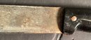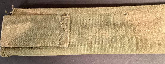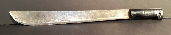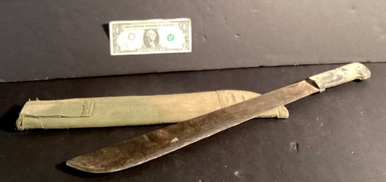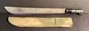 The machete has a black full tang handle. The canvas sheath has the imprint of A.M.E. .C. 194& A. F. 0107 with a belt loop to hold the machete and sheath.