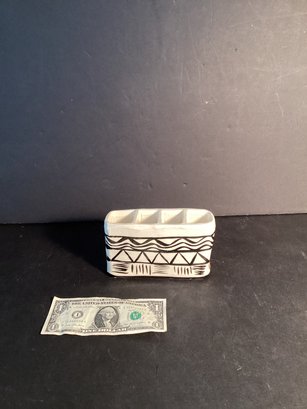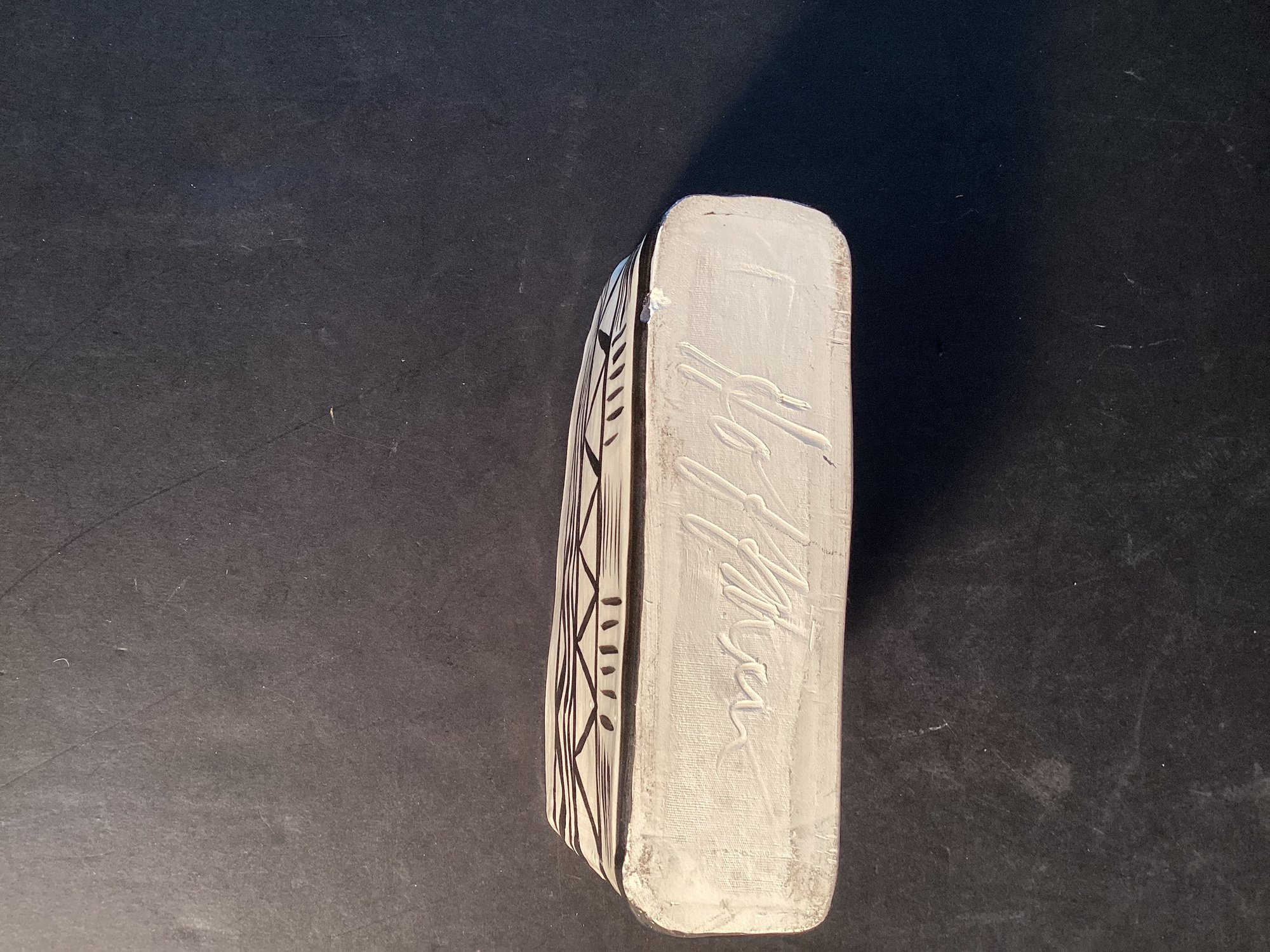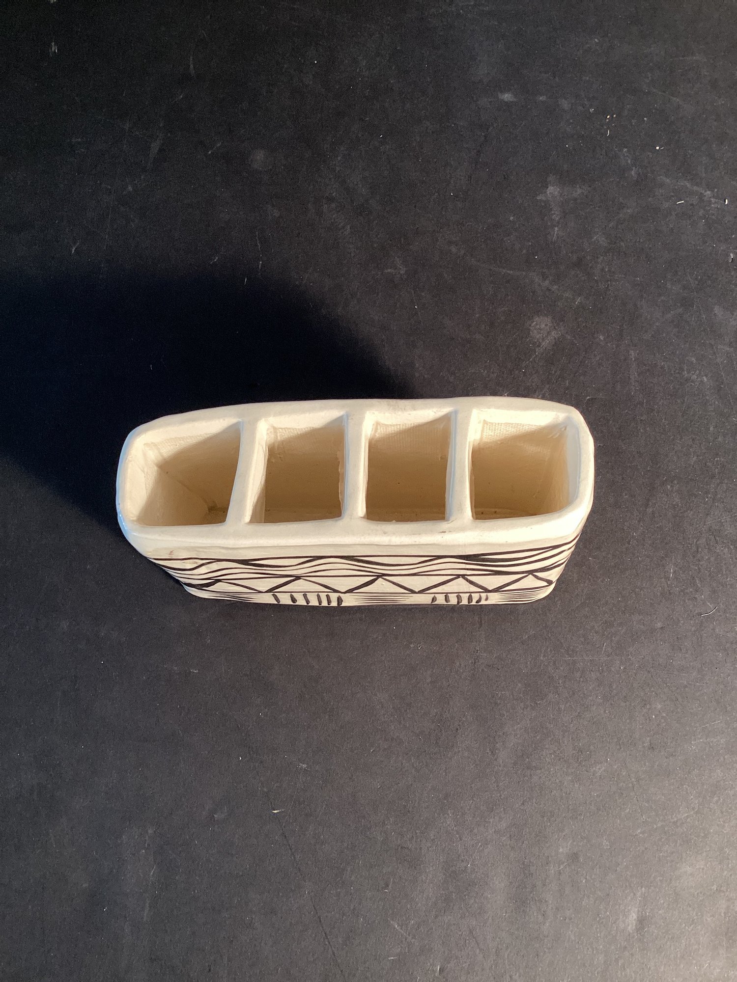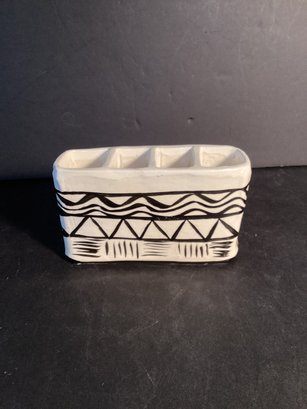 Here is a very hand made nice desk companion in white clay, with a black design and a high glaze.