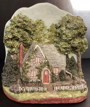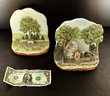 One bookend has a cottage design with trees, and a small fence and flowers.