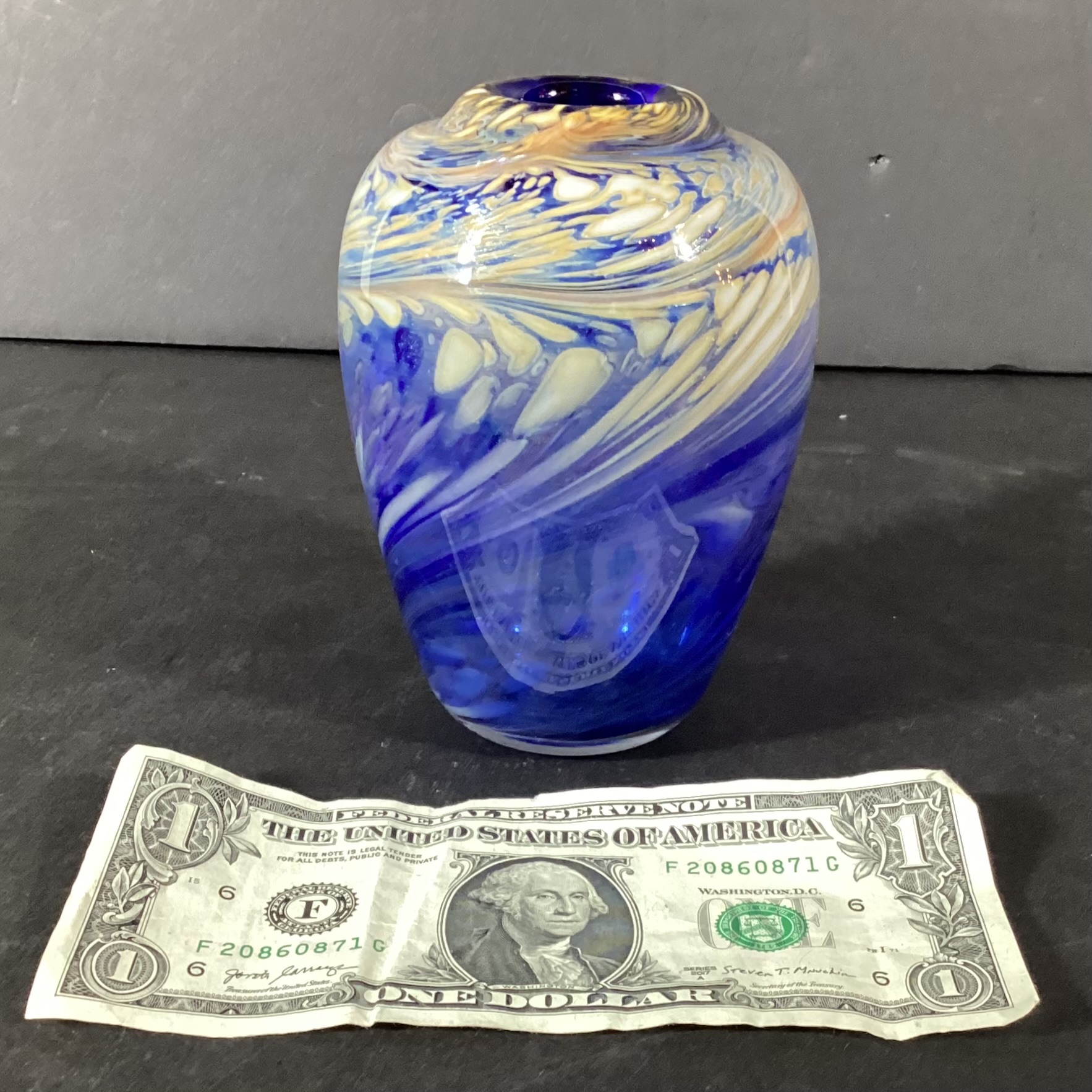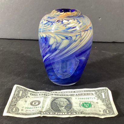 The art glass vase measures5” in height x 1.5” diameter for vase opening, and 2” diameter at the base.