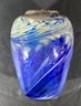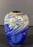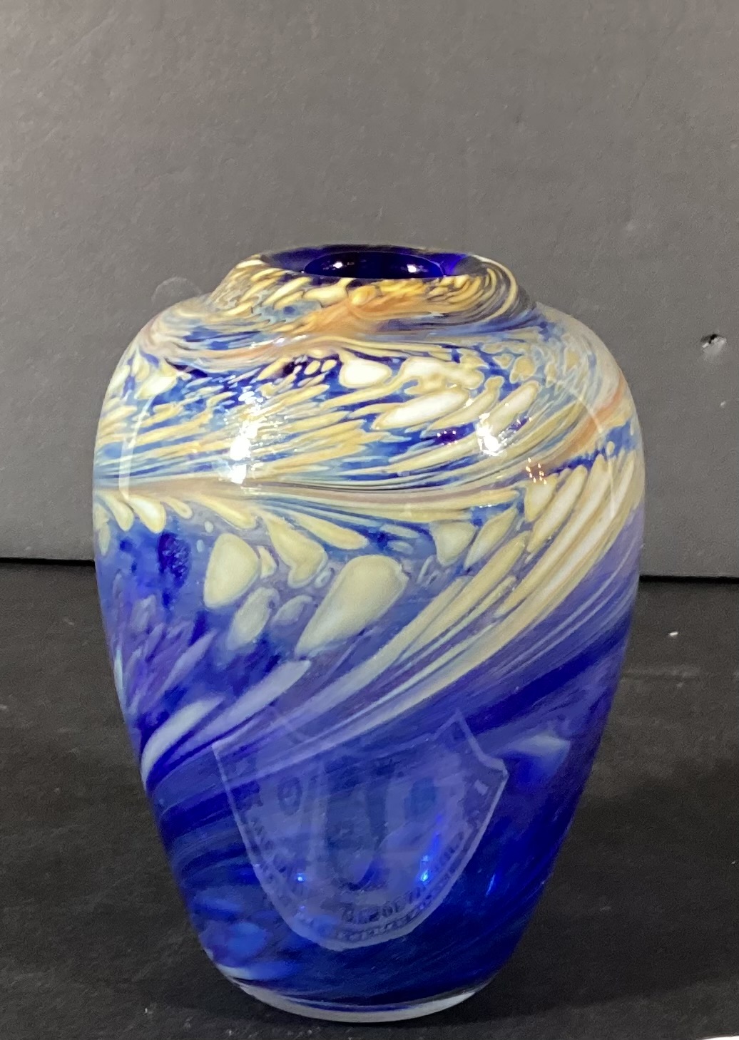 Here is a superb art glass vase in gold and ivory on cobalt blue glass.