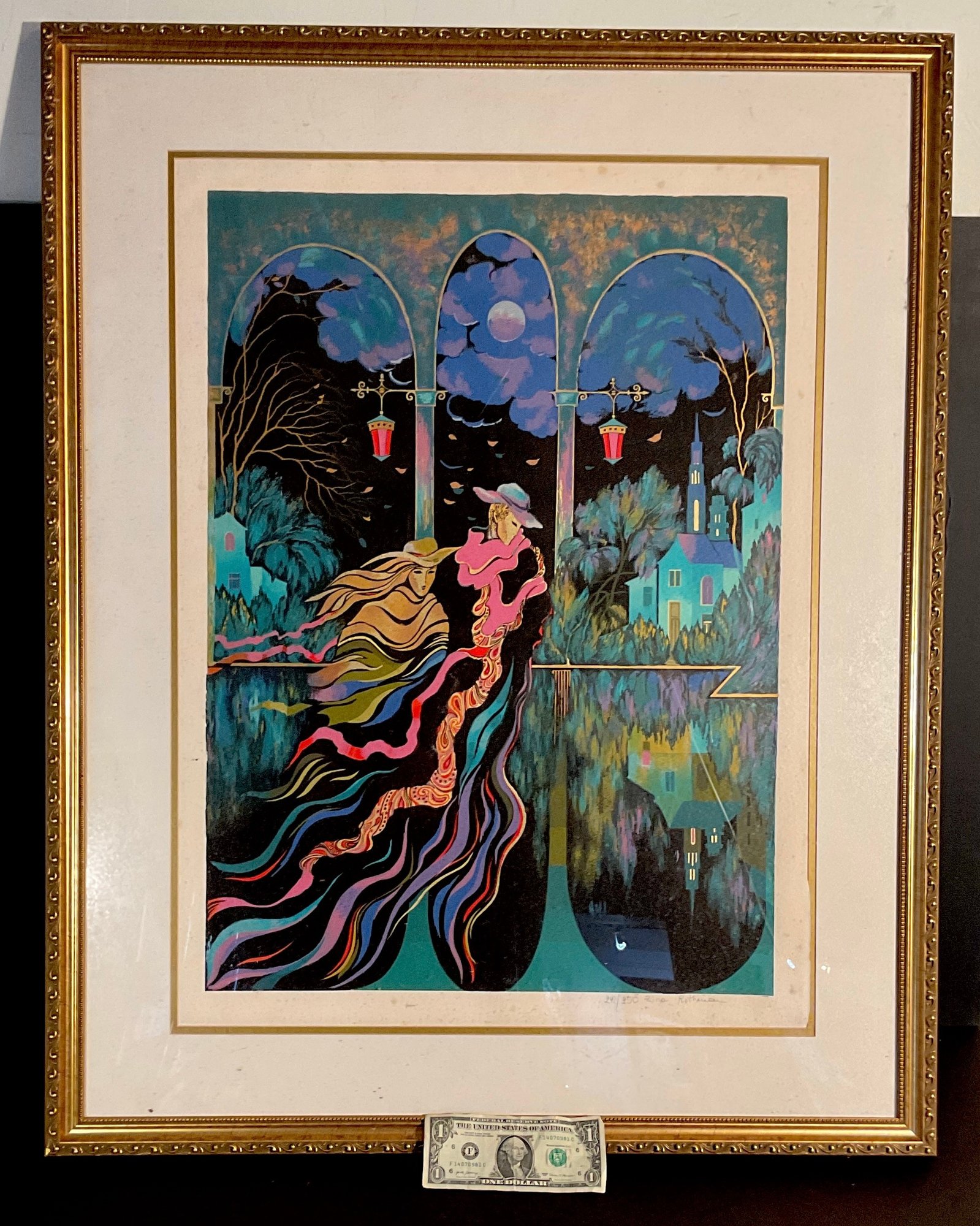 This print is signed & numbered in pencil. Very well executed in design and color. Gold highlights add to the overall complexity. Nicely framed.