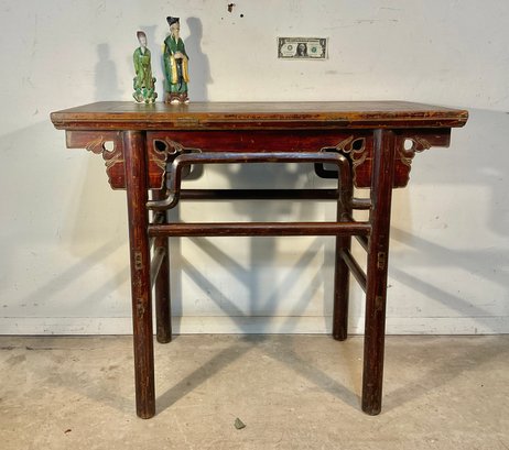 This table is a great size. Extremely hard to find normally they are 2 to 3 feet longer at least. This table has an original finish a medium dark ox blood. It is scrubbed off the top pretty much but it still evident. I don’t believe there are any replaced parts on this table. It looks all original inside and out.