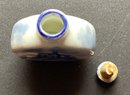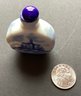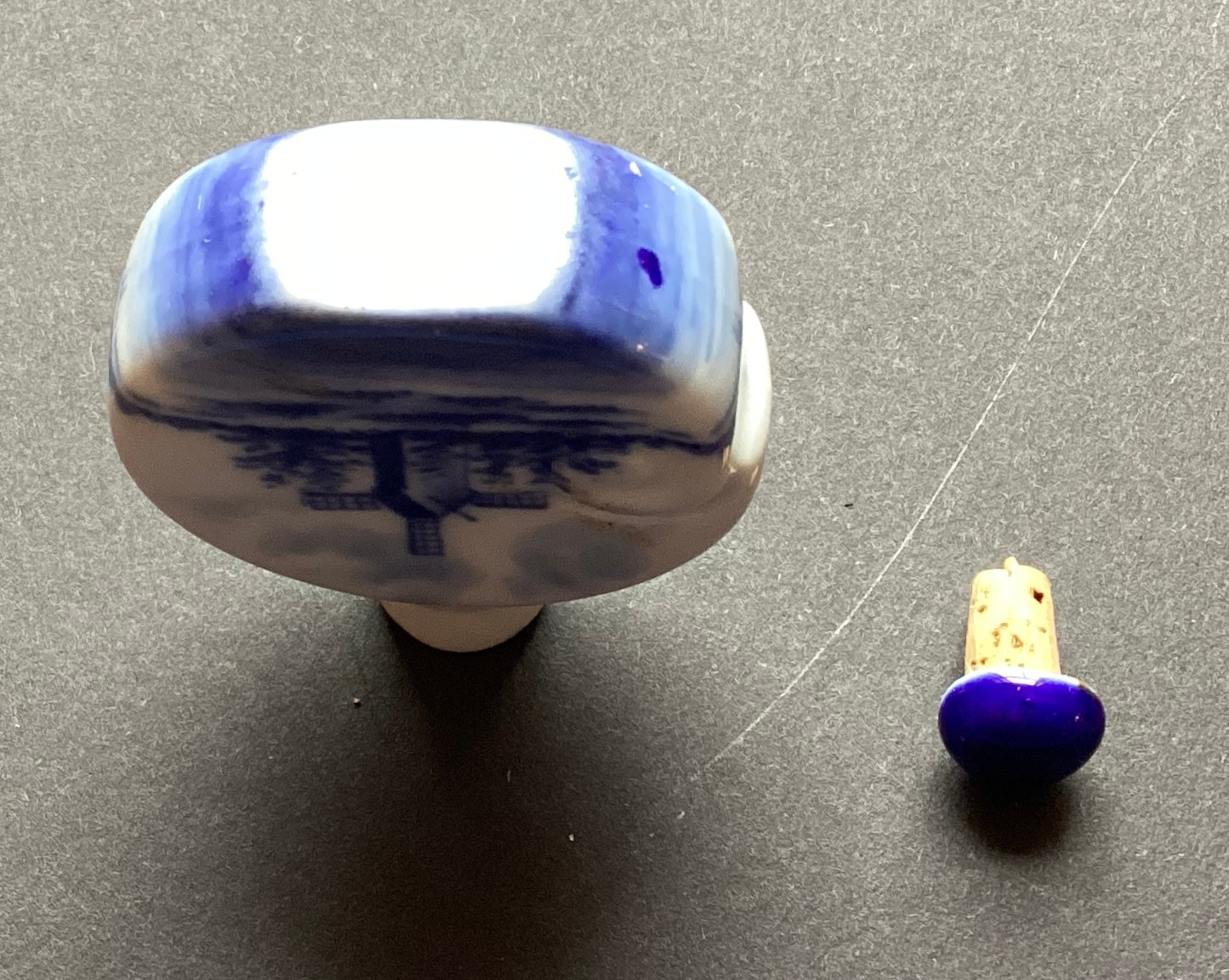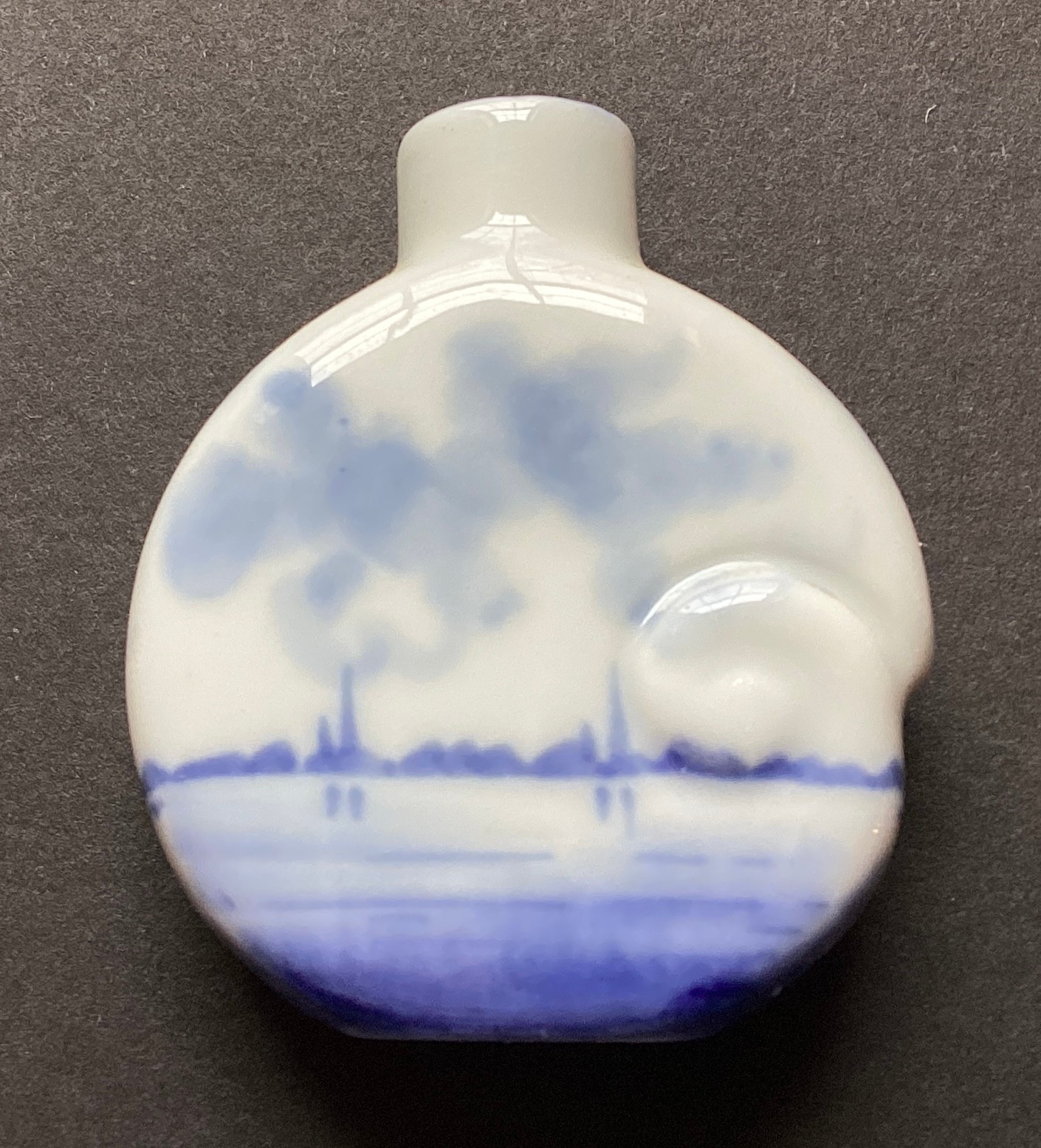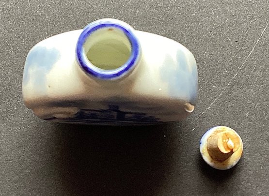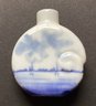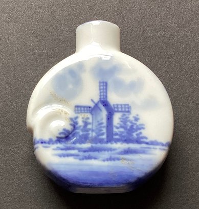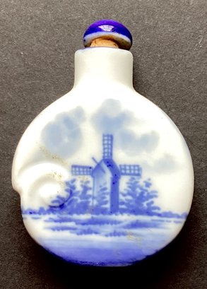 A very nice small round ceramic snuff bottle with a dream alike design of windmill water and trees.