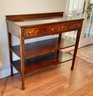 This is a really good quality piece of furniture probably made in the 1920s nice solid wood. The finishe is decent. And the two drawers provide storage. One of the shelves the wood is coming unglued that’s an easy fix. Good quality furniture like this is hard to come by no fillers no sawdust no cheap fasteners, just decent quality furniture.