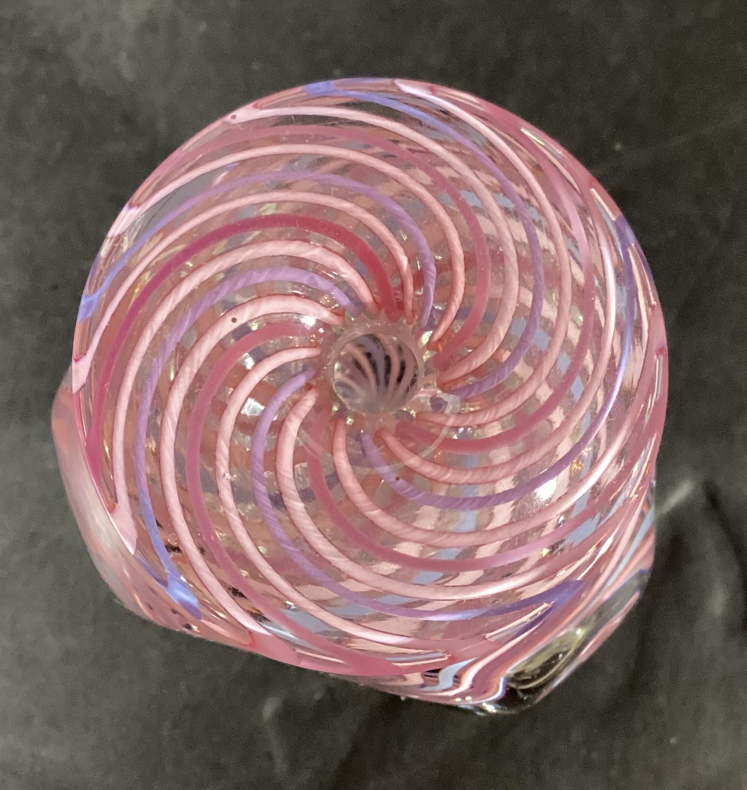 This is a single bud vase, and has an inner diagonal design of pink, rose, and blue glass with clear glass for the base of the vase.