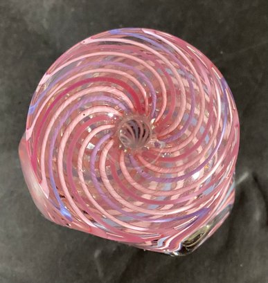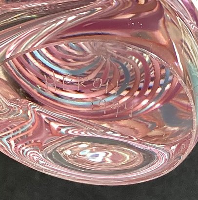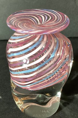Signed ‘Heron’ 1994 and measures 3.5” in height x 1.5” at the base x approximately 1.5” swirled glass top.