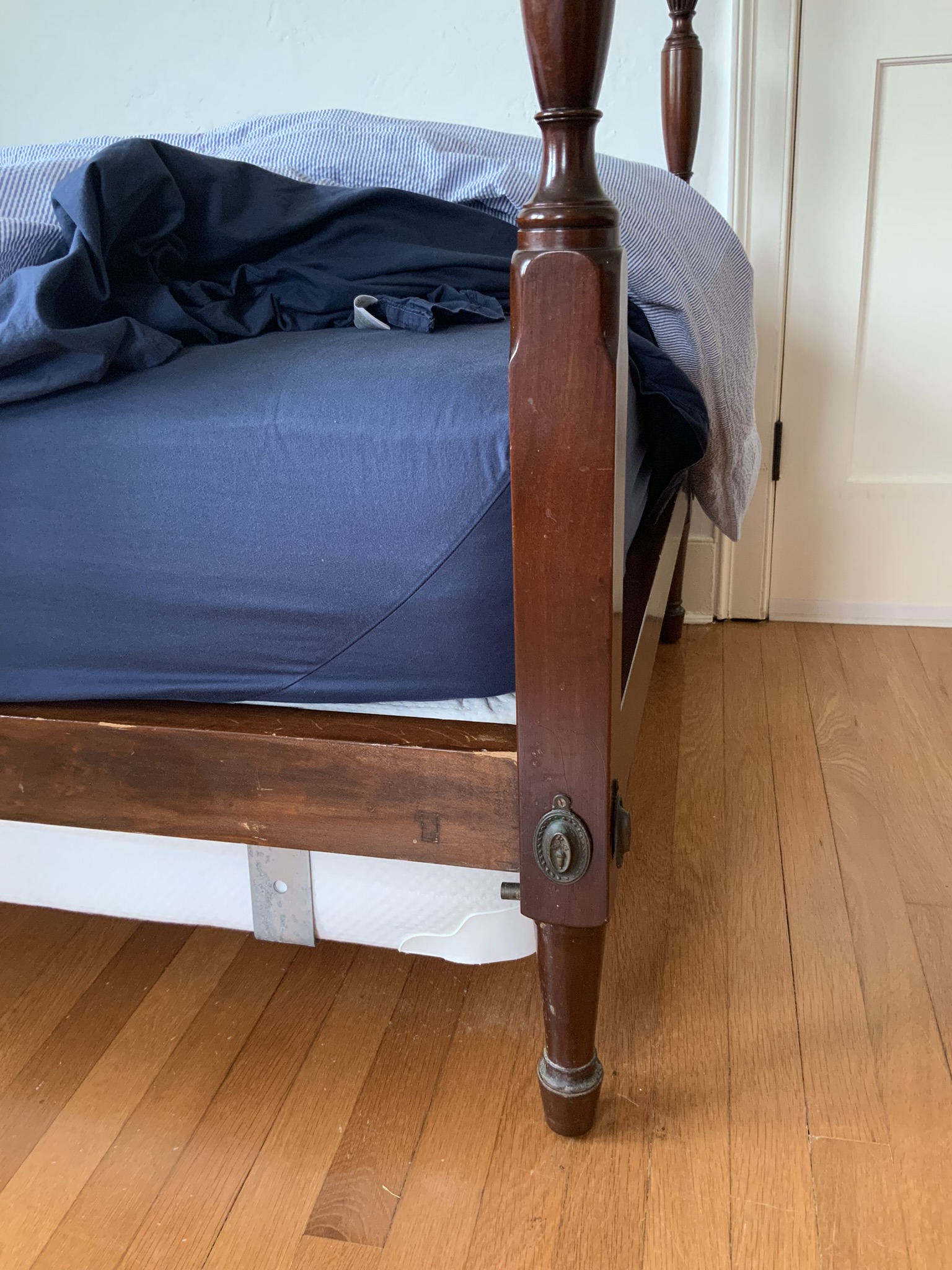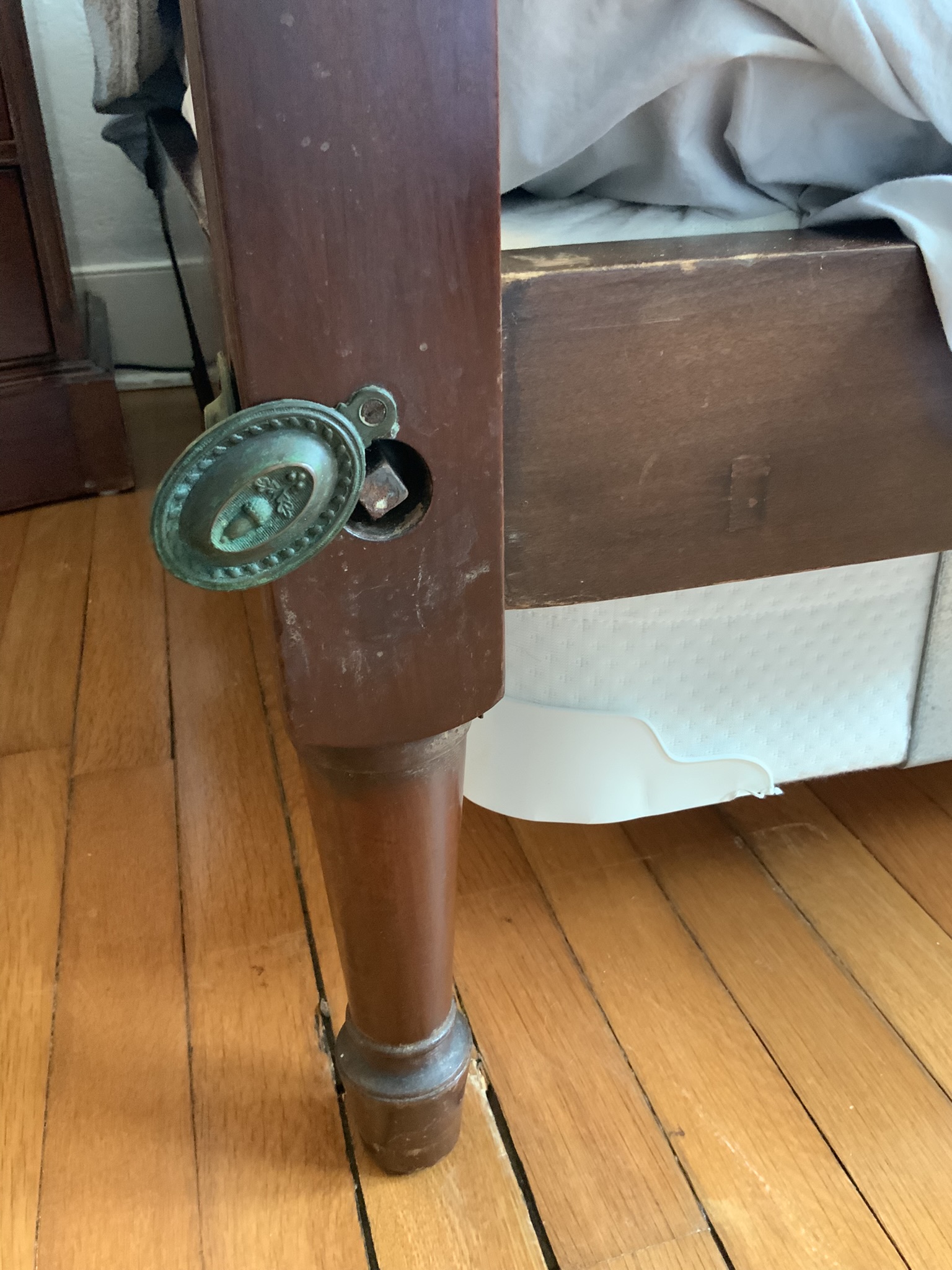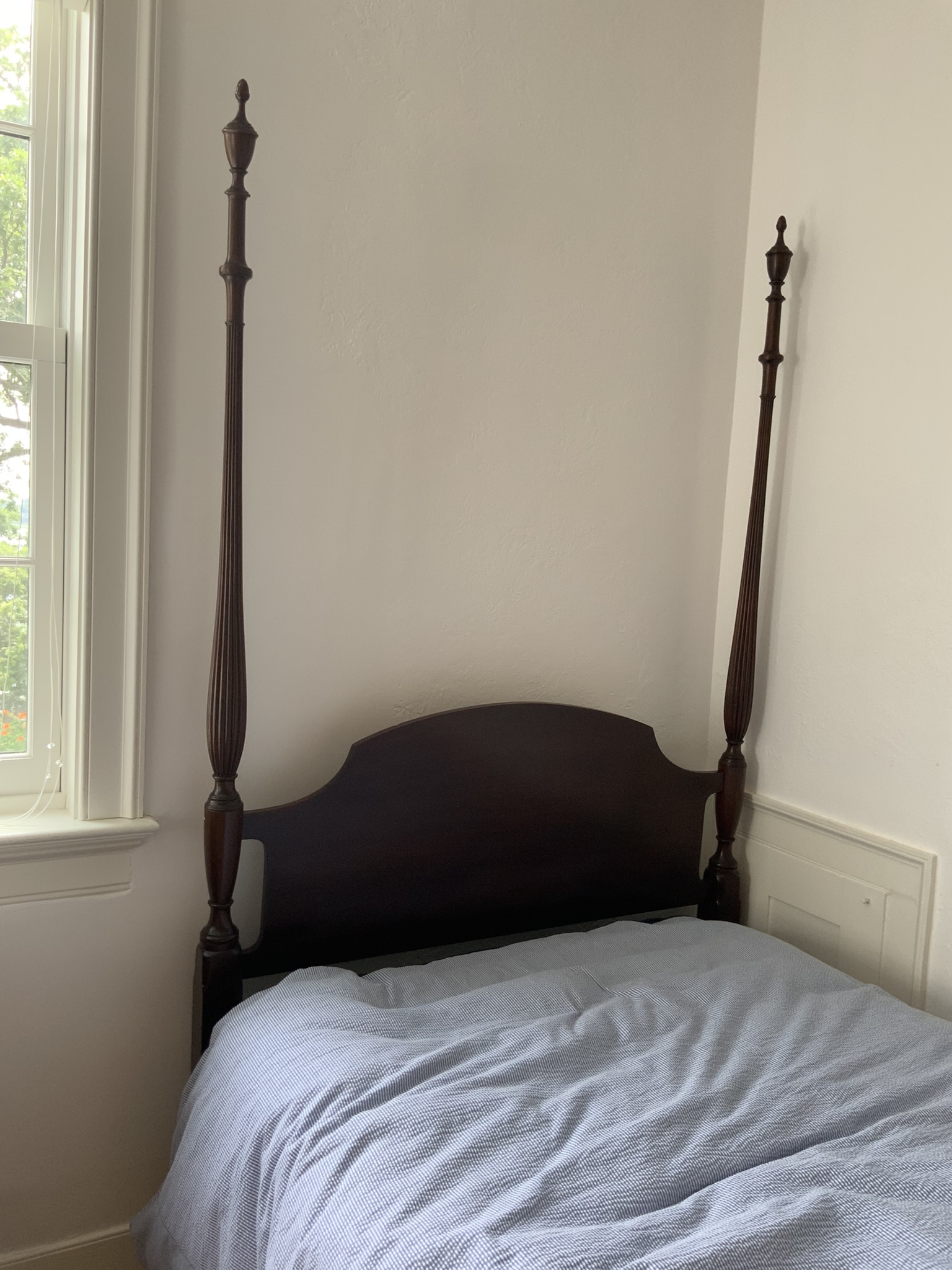 Selling a pair of custom made Solid Mahogany delicate Tall Post Single beds. Standard sized Beds With readed tapering posts that are very slender. All solid mahogany. Circa 1930- 1940’s