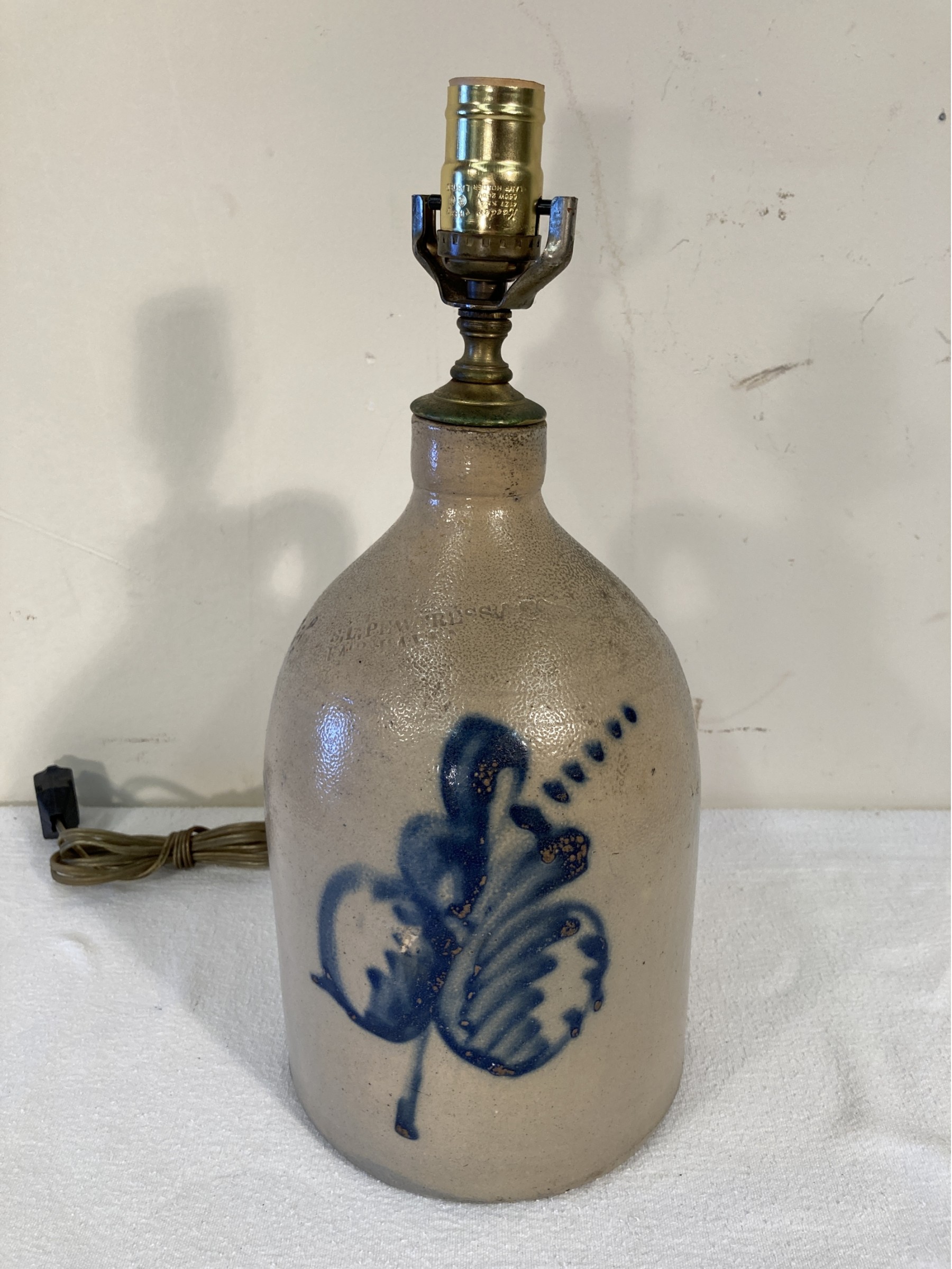 Selling a very nice antique stoneware jug that has been converted into a lamp. Stamped S.L. Pewtress New Haven Conn on the front. Salt glazed. C. second half of 19th century.