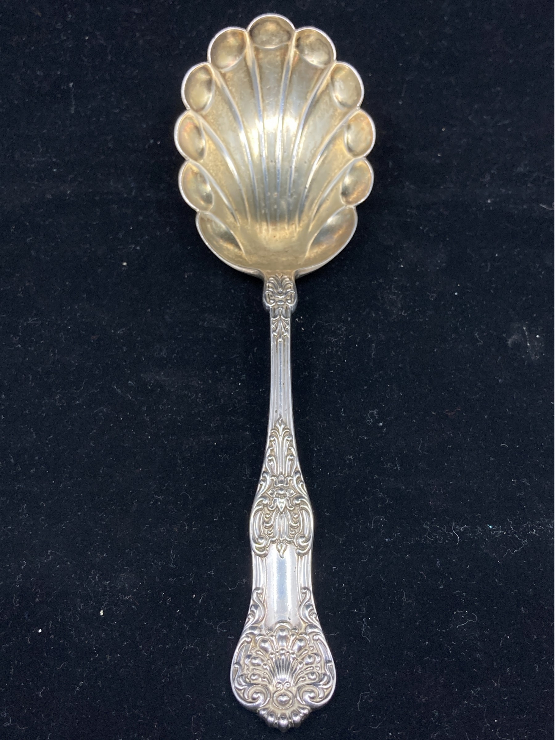 Selling a nice vintage sterling silver serving spoon with a gold wash. A scalloped edge spoon decorated with shell and and acanthus relief. Marked on the back sterling,