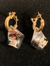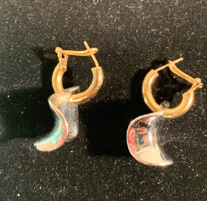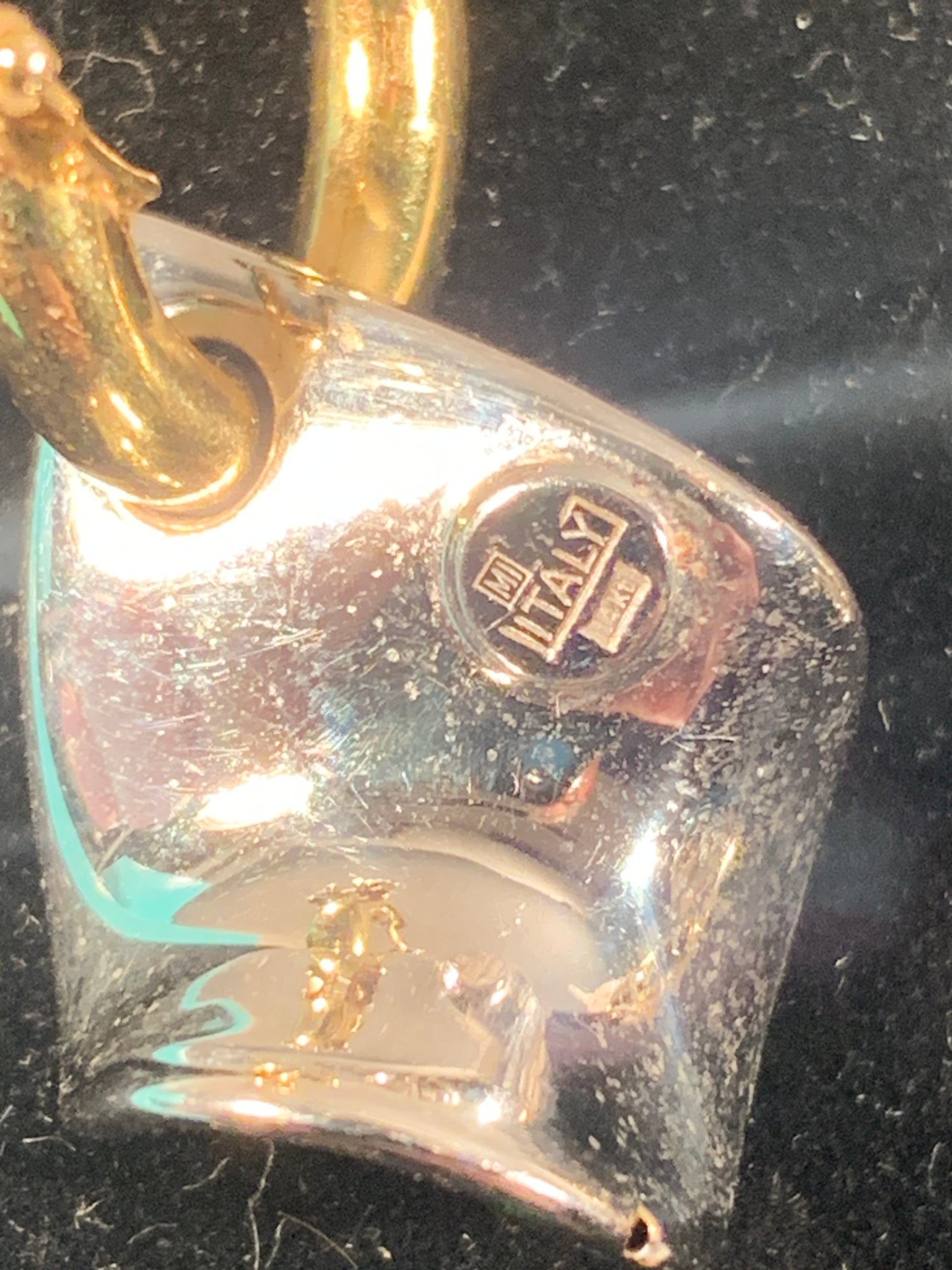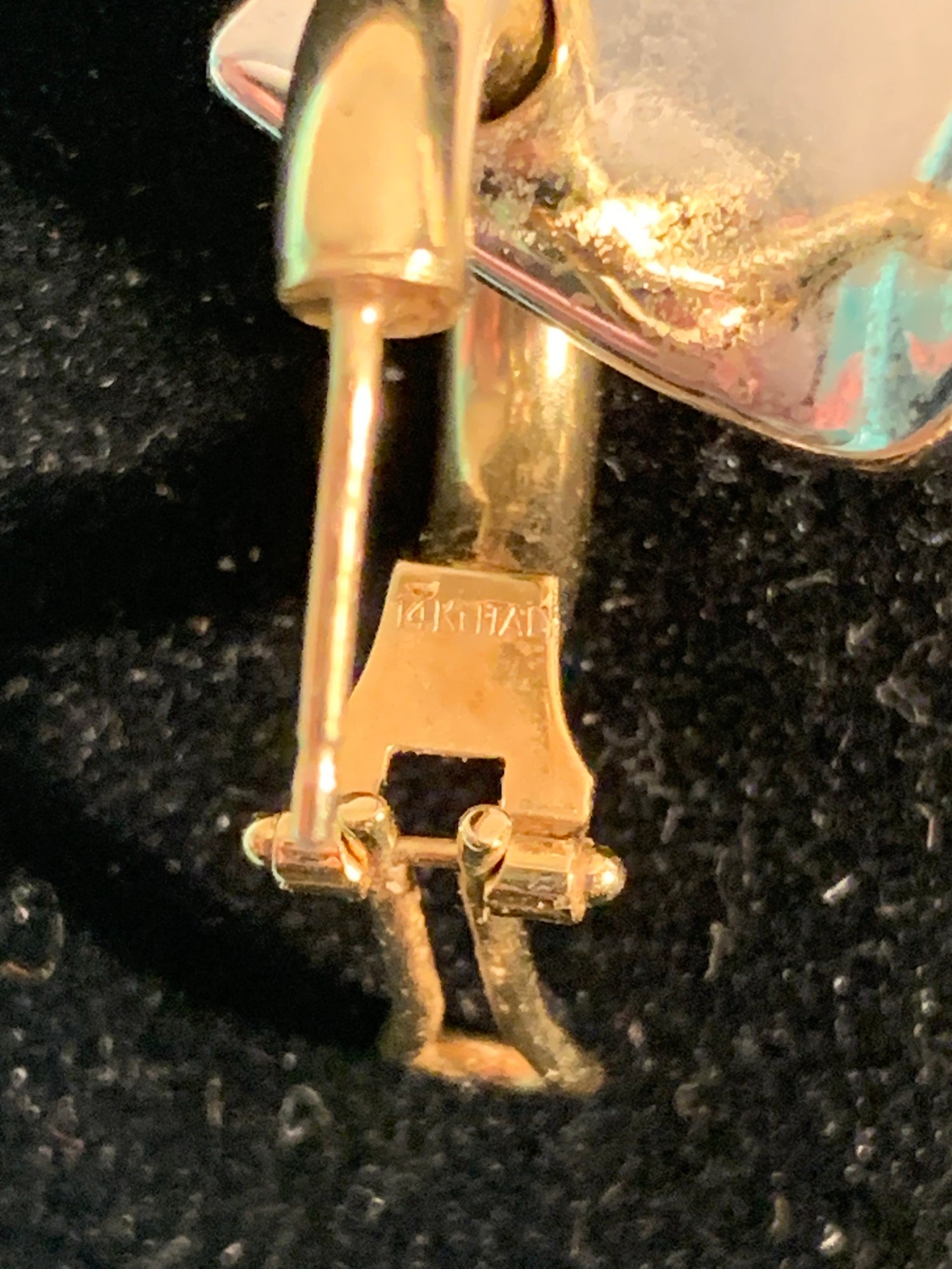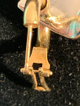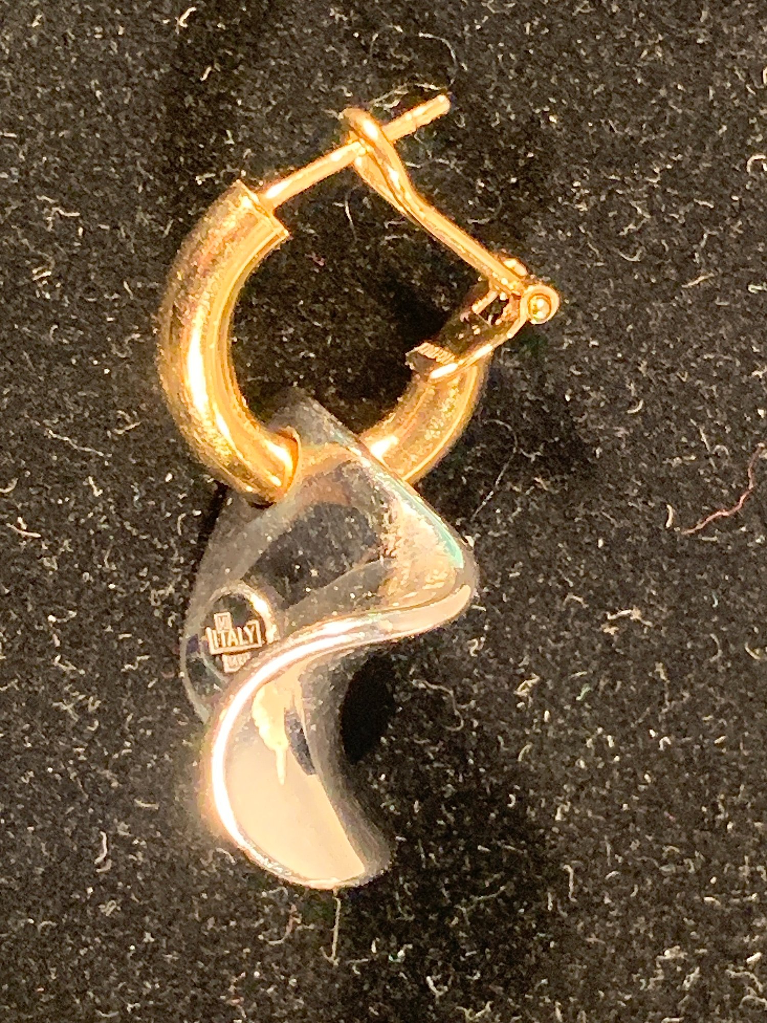 Marked in 4 places 14K. White gold piece can be removed if you would like to wear just the yellow gold hoops. They are very well made and very well designed. Contemporary styling.