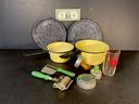 Everything pictured is in extremely good condition. There are very minor flakes on the two plates. The pots are in excellent condition and the rest of the articles are as well. All are vintage from 1920-1930 era.