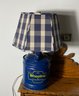 Vintage Wheeling blue gas can converted into a table lamp. Very good condition, hand made shade included.