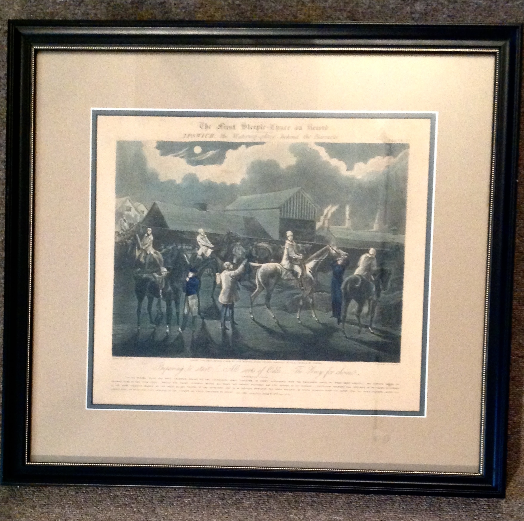 This is a very fine engraved plate with jockey and horse preparing to race. Drawn by H. Alken. In very good shape, and great muted coloring with accompanying mats. Measurements: 24 1/2" width x 22 1/2" height.
