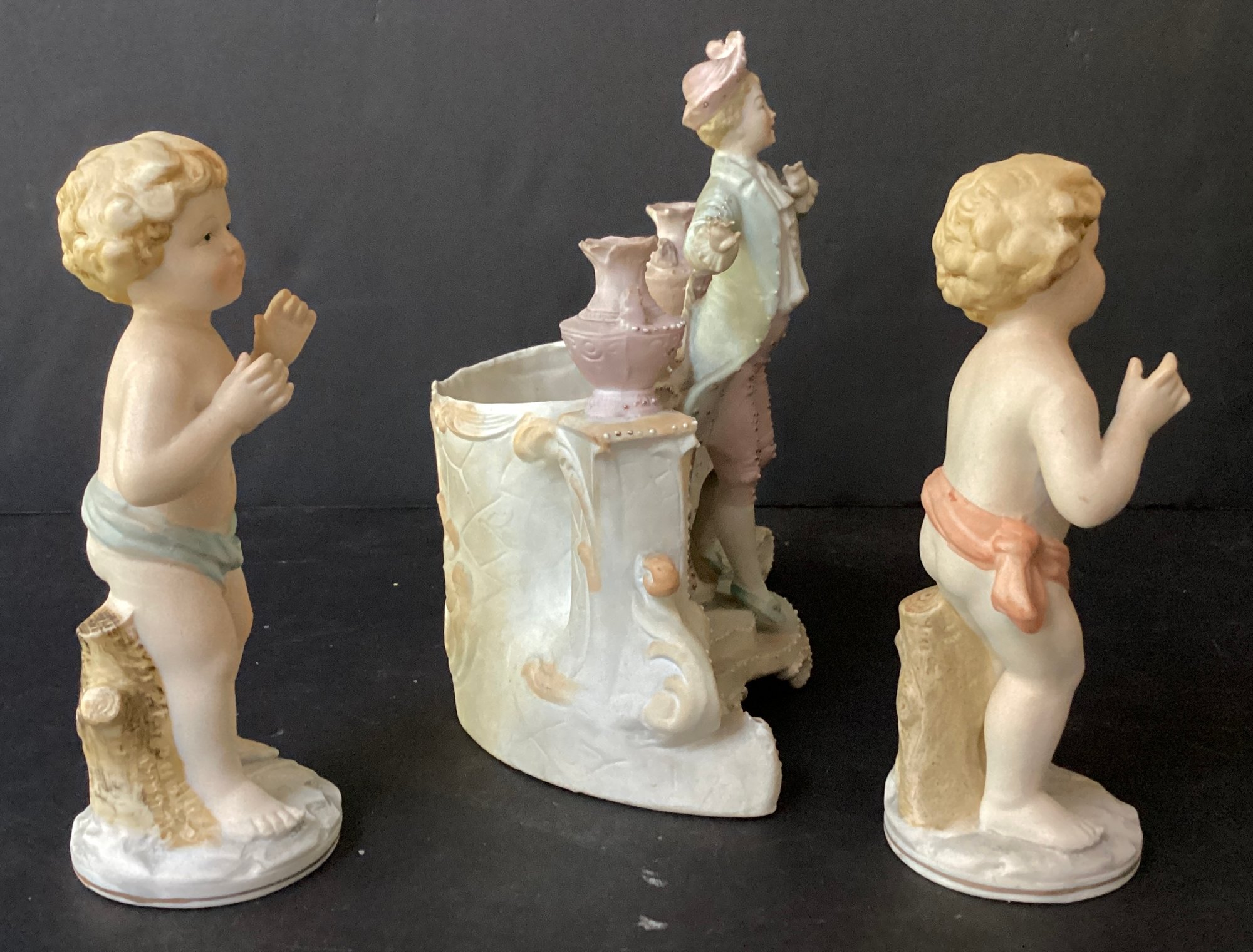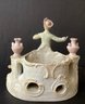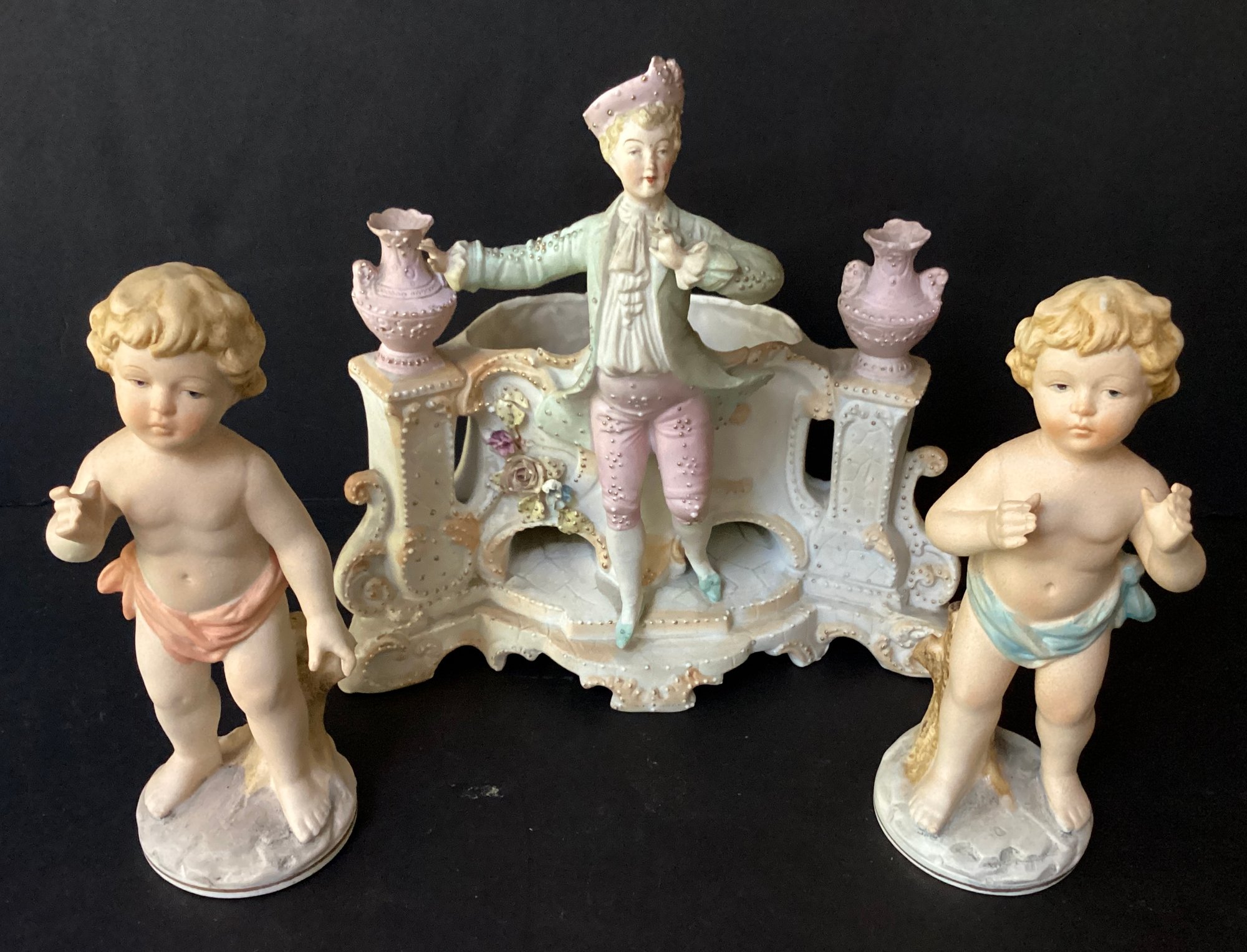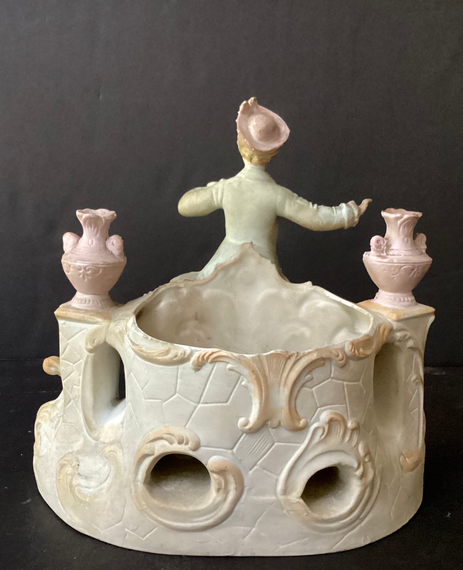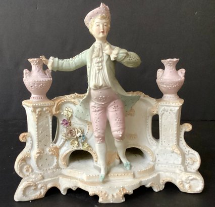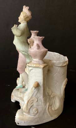 Here we have three hand-painted porcelain painted figures for your home.* the first figure is the largest of the three. It sports a young man in fine clothing, with having a pale pink toned planter on each side of him. Behind him is an opening for flowers, a plant or baubles. He is in fine condition with a tiny chip on his hat. He measures 8.00” x 7.50” x 4.00”.