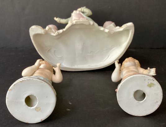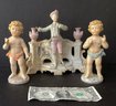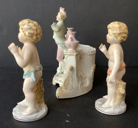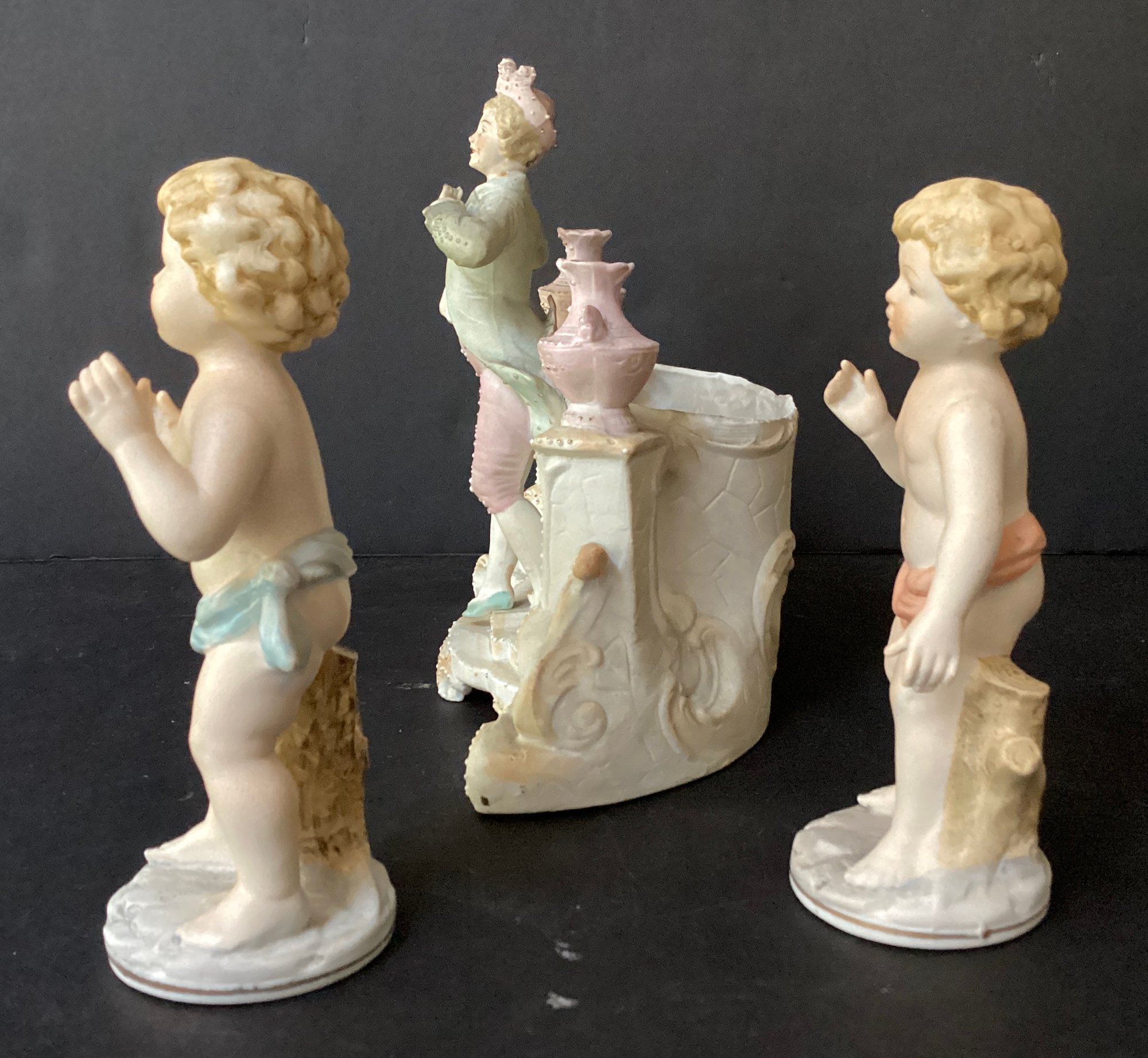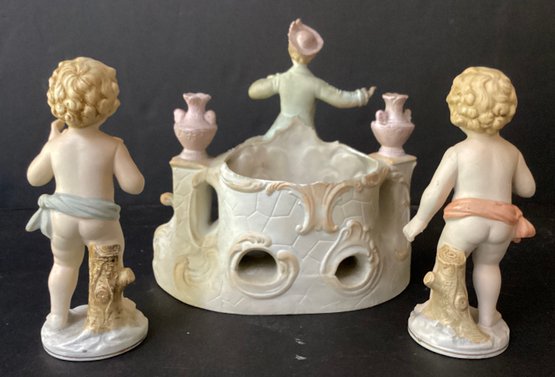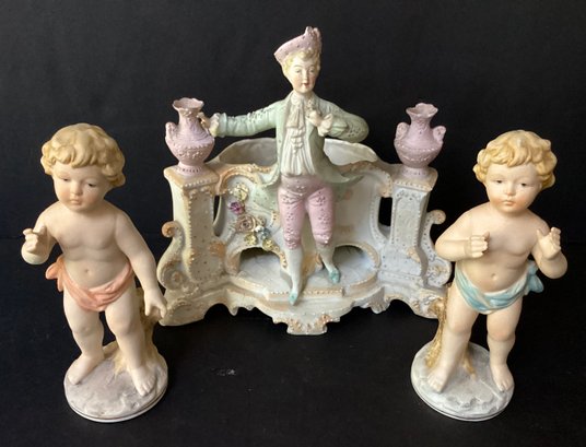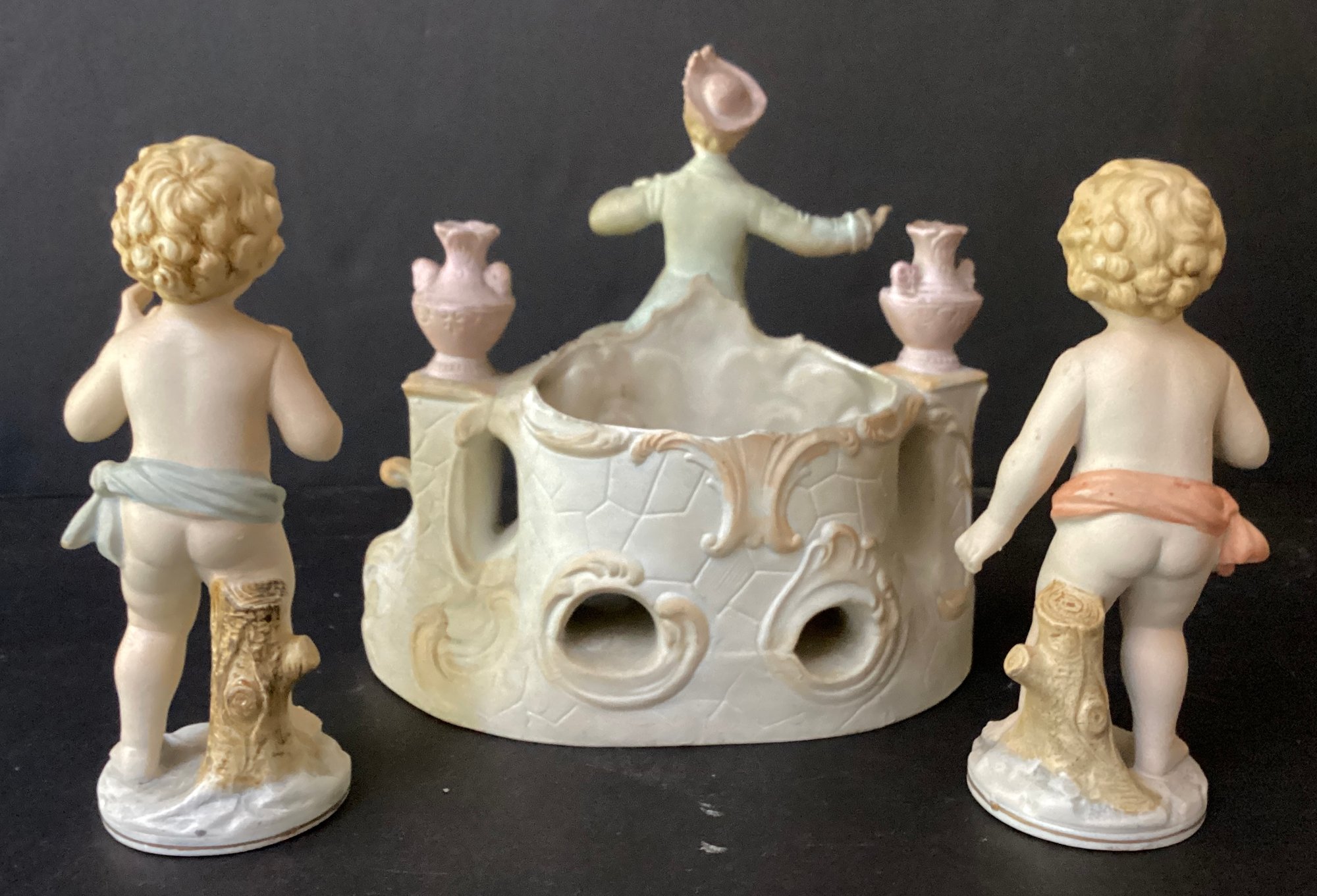 Here we have three hand-painted porcelain painted figures for your home.* the first figure is the largest of the three. It sports a young man in fine clothing, with having a pale pink toned planter on each side of him. Behind him is an opening for flowers, a plant or baubles. He is in fine condition with a tiny chip on his hat. He measures 8.00” x 7.50” x 4.00”.