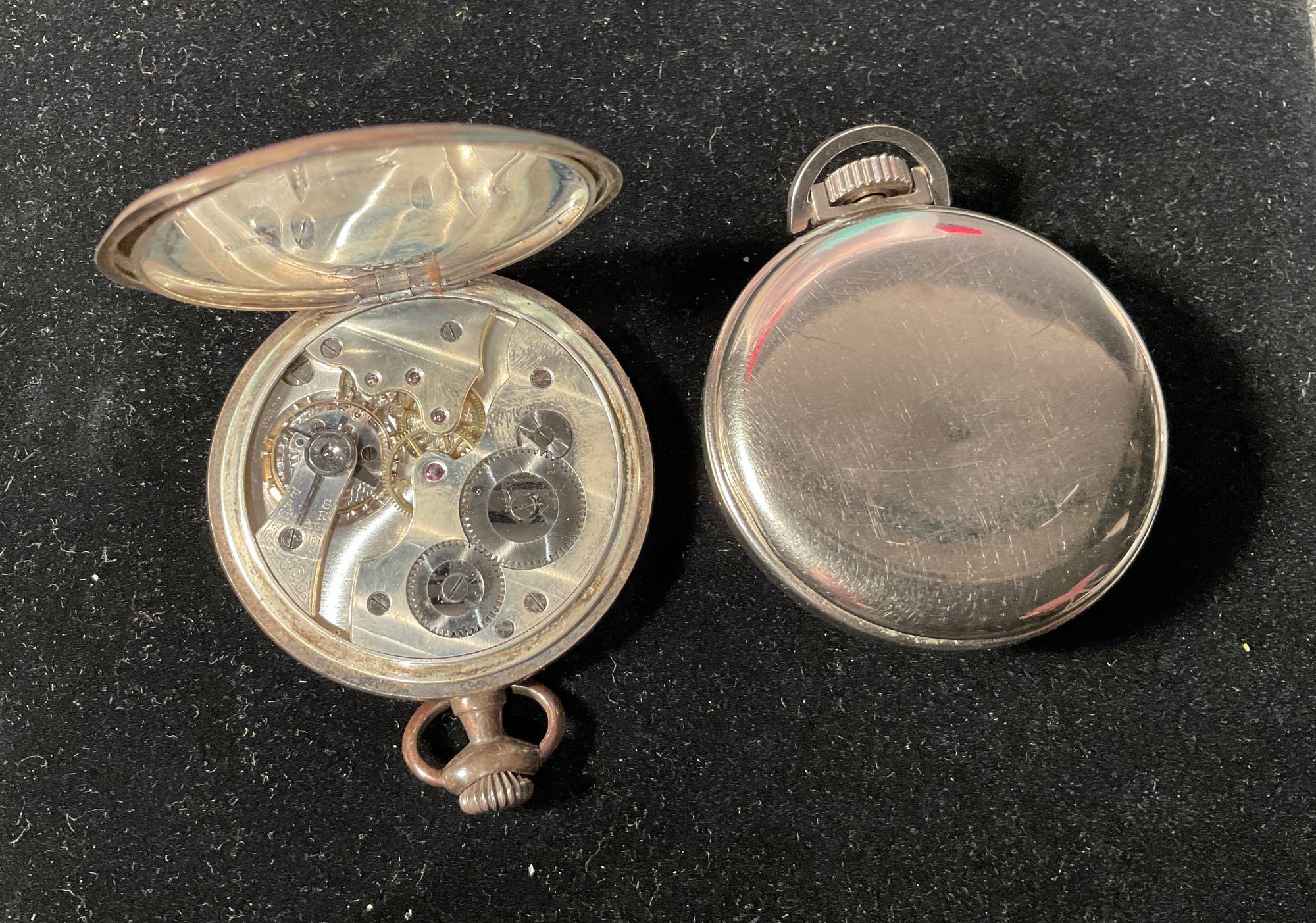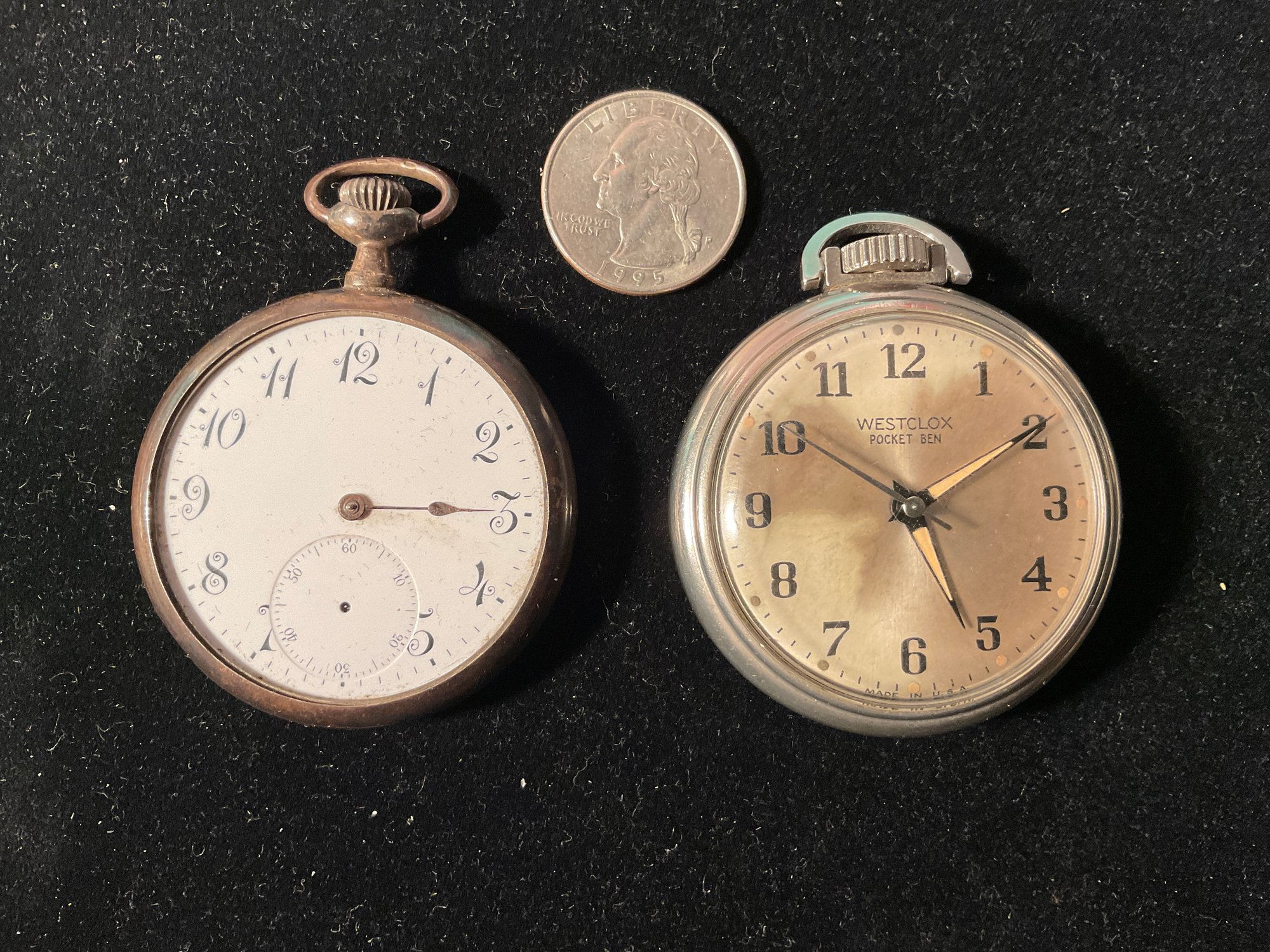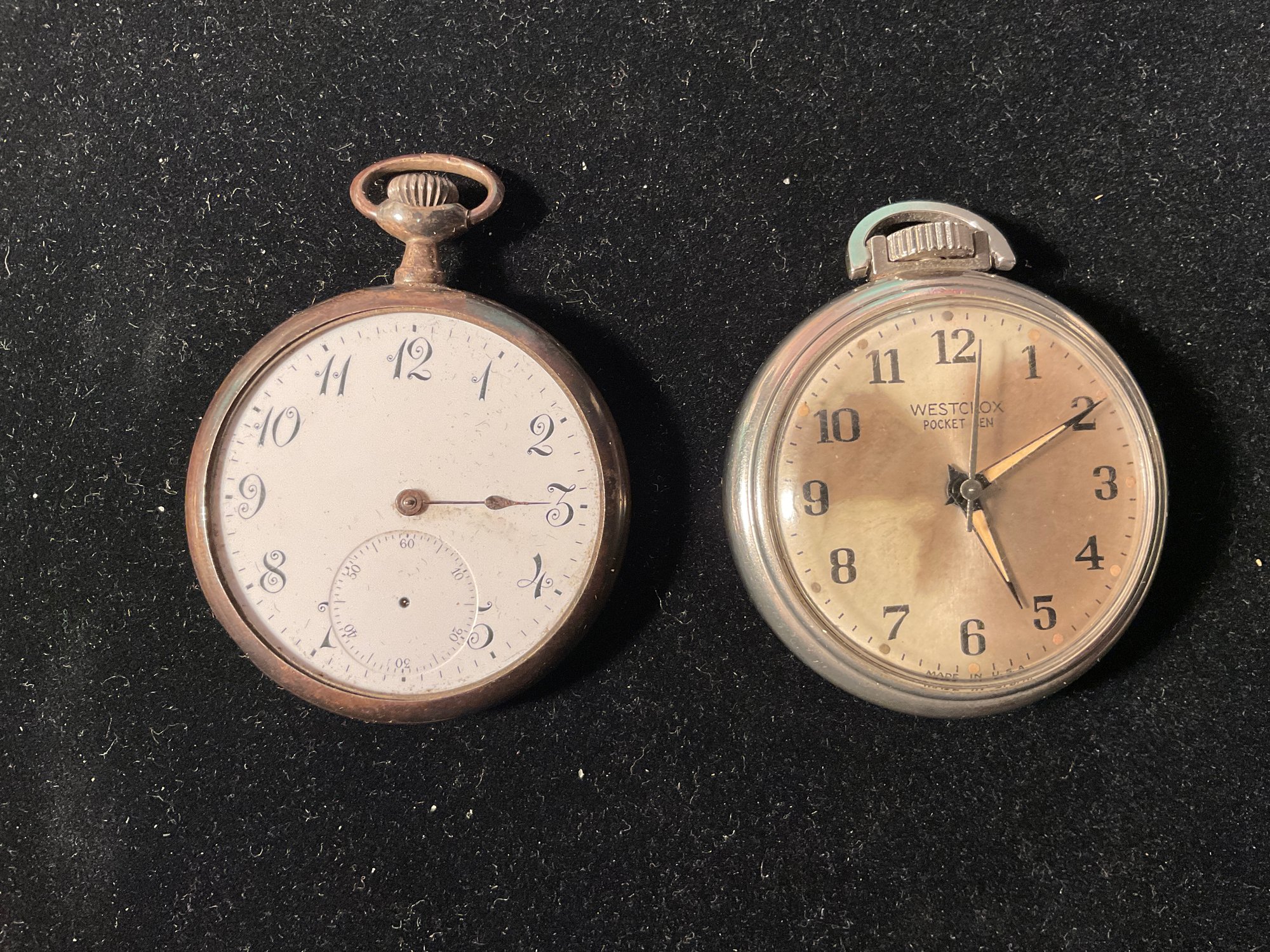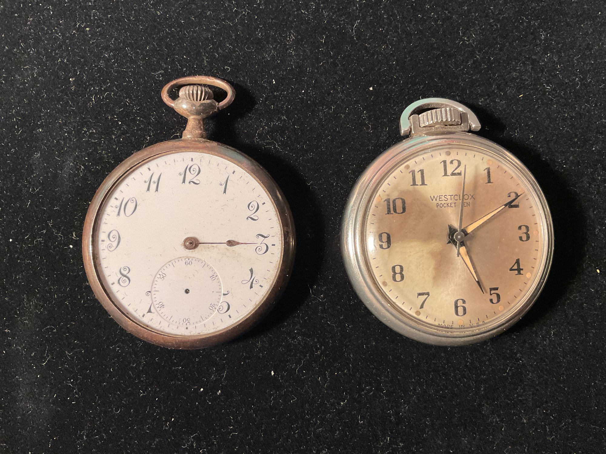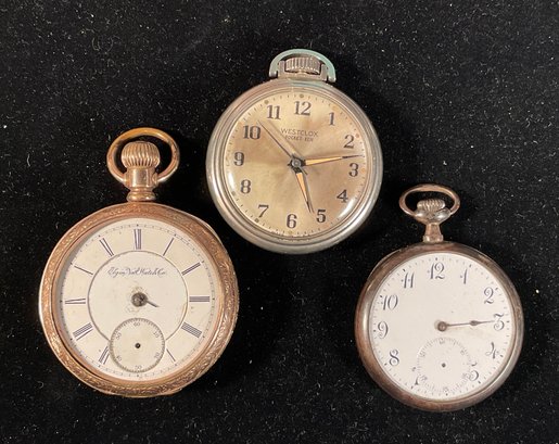 We are selling 3 vintage pocket watches. One is Gold filled, one Is marked Swiss and is sterling silver and is hallmarked. The third watch is a 1950 Westclock watch that is running. This watch is nickel plated.