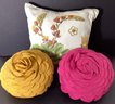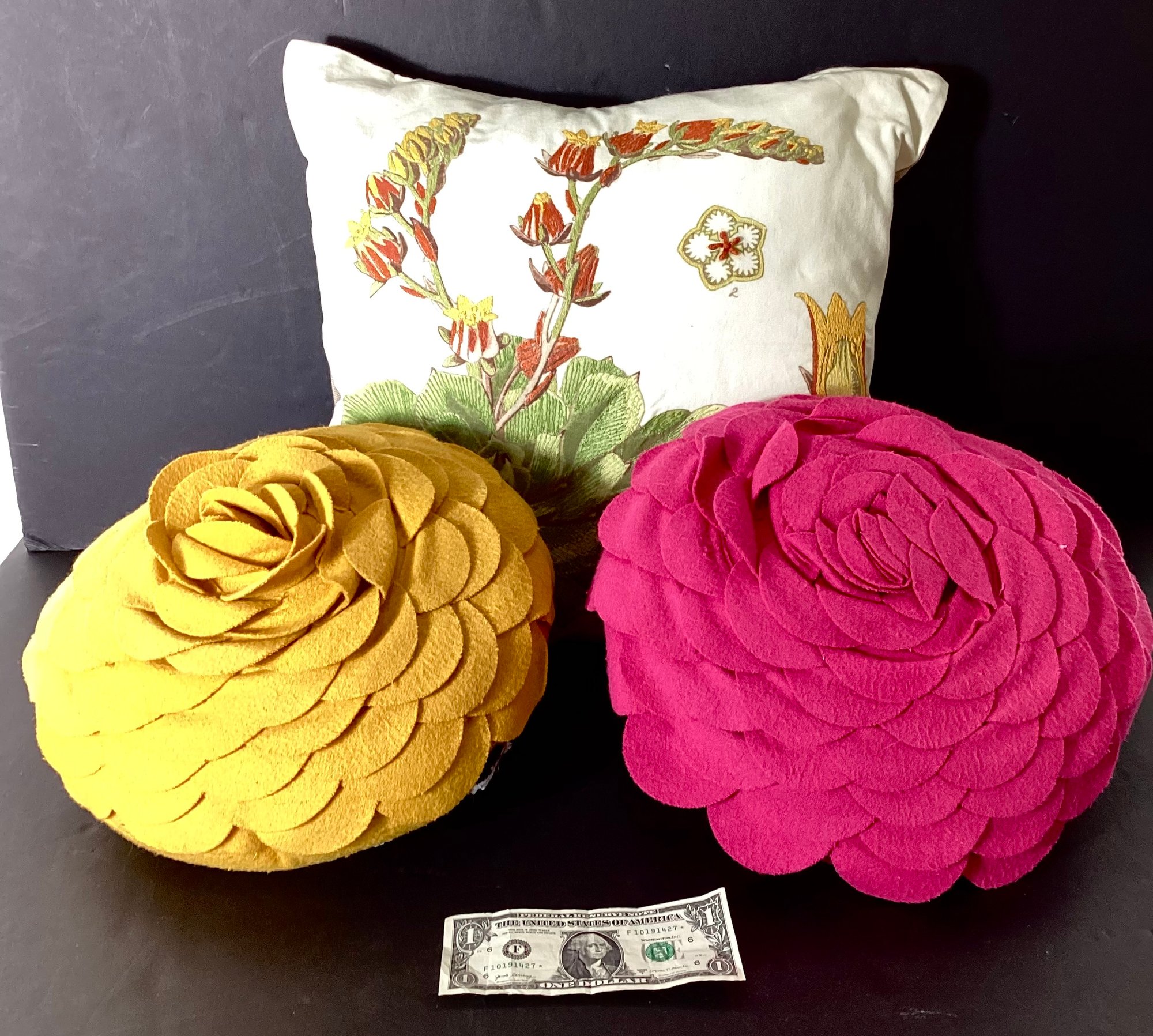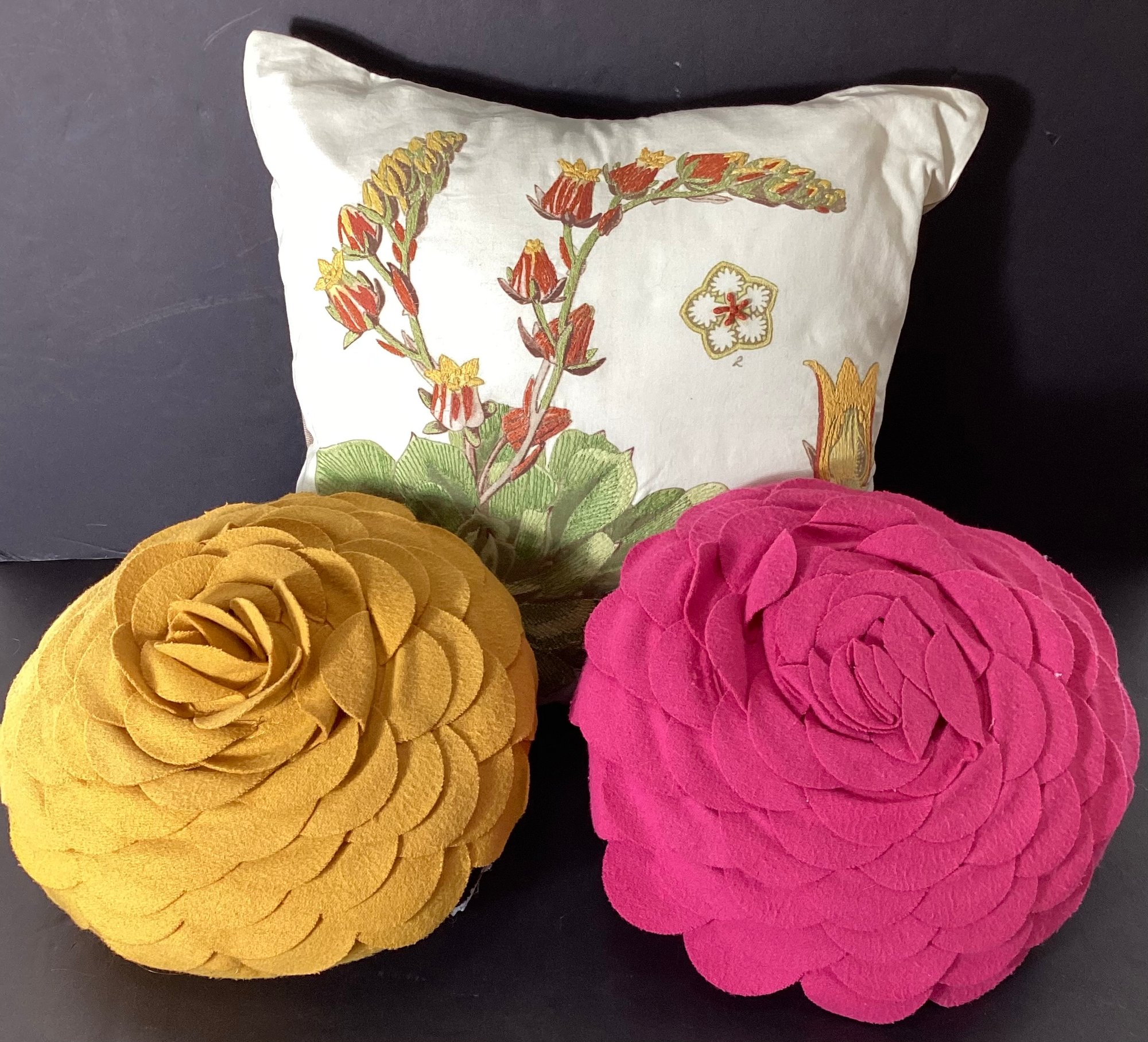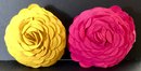 * Two felted material pillows in a rose pattern. Both are mono colored, and one is in a fuchsia color and the other a brilliant mustard yellow. Each pillow is approximately 9” in diameter.