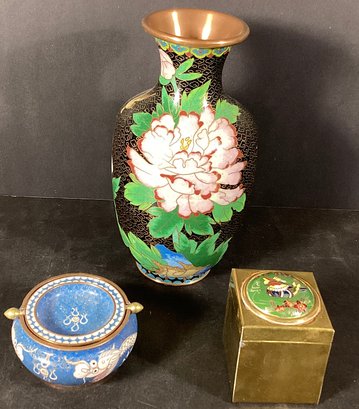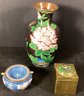 * The first item is a small brass box that has a removable lid.the lid has a Cloisonné image of two ducks and maple leaves. This box measures 2.25” and has a height is 2.75”.