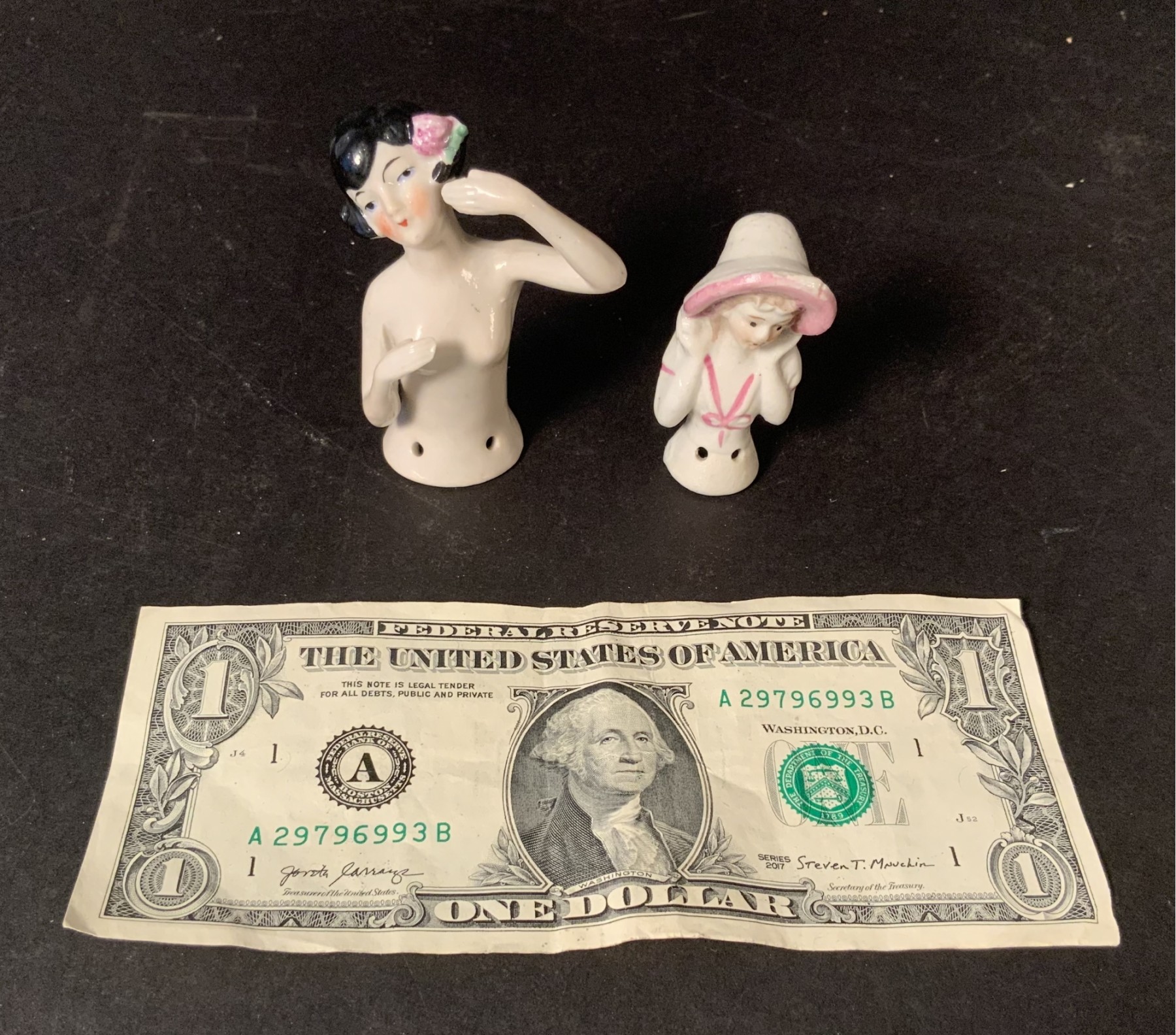 Both are in good condition. It looks like in the photo that the larger doll has chips of paint missing in the hair, that’s just glare from the light. Both are in great condition.