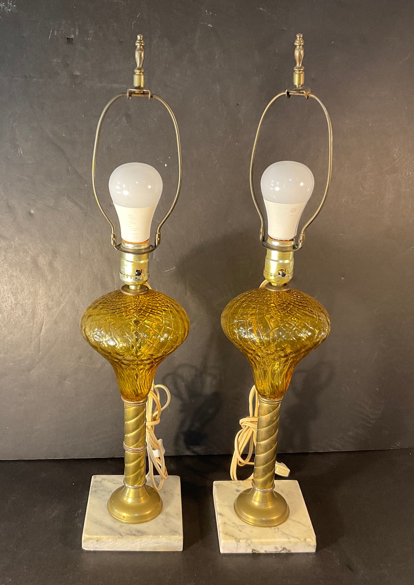 Wow! Here we have two very cool, very vintage amber, glass, and brass/marble lamps for your consideration. Glass fonts are not drilled for wiring