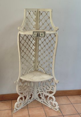 You are purchasing a Victorian fancy sticking ball corner shelf that has been painted white, but it’s sturdy and very useful. Underneath the paint you’ll probably find walnut or mahogany wood. Pegged construction age-appropriate where
