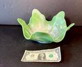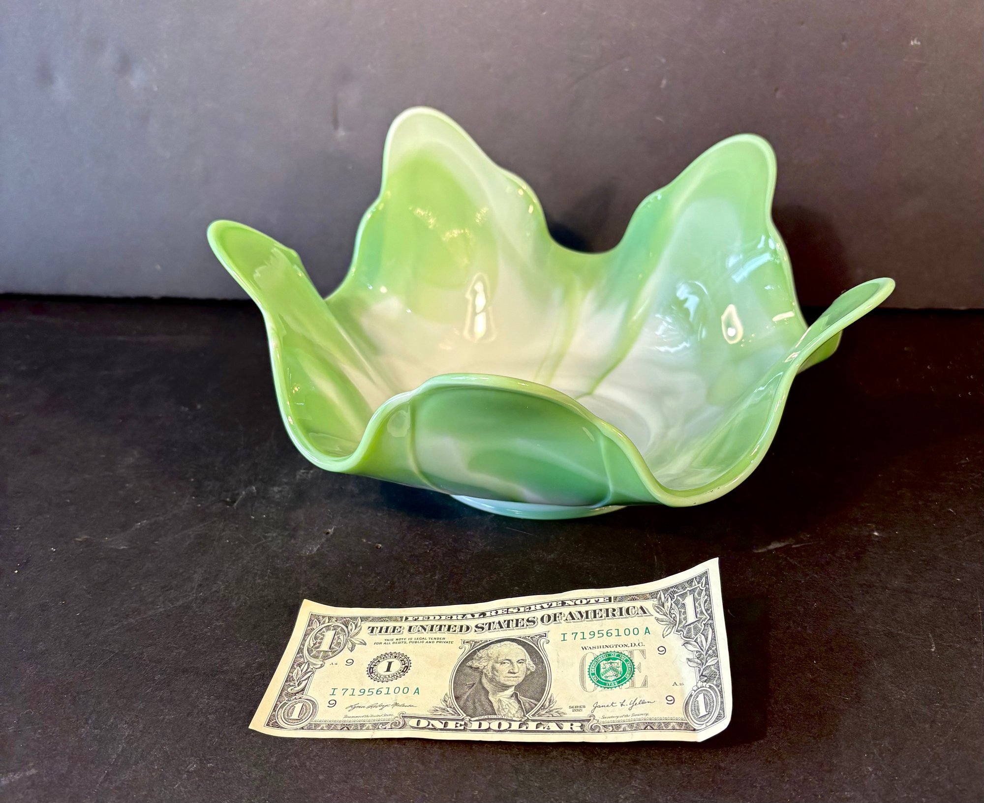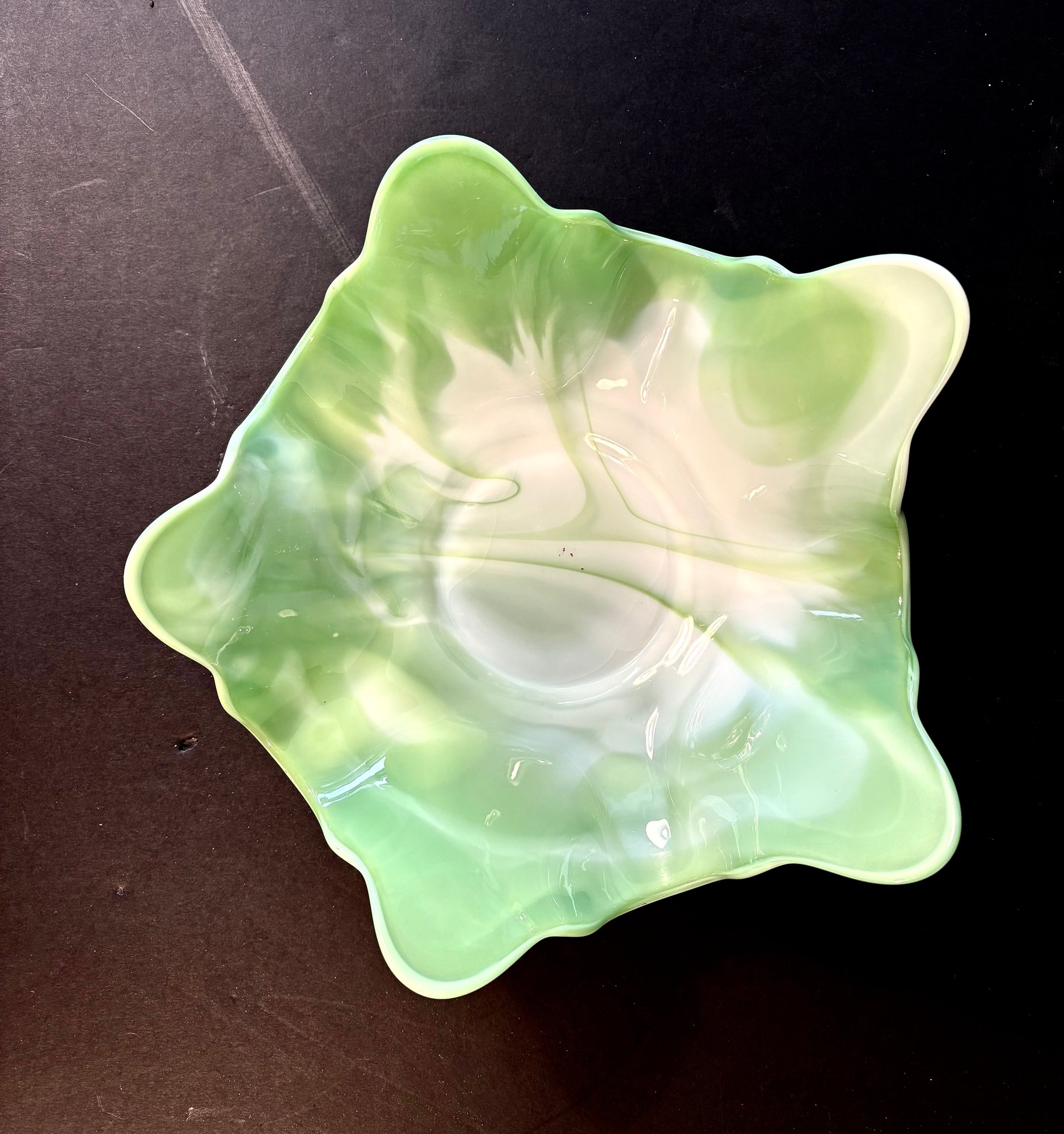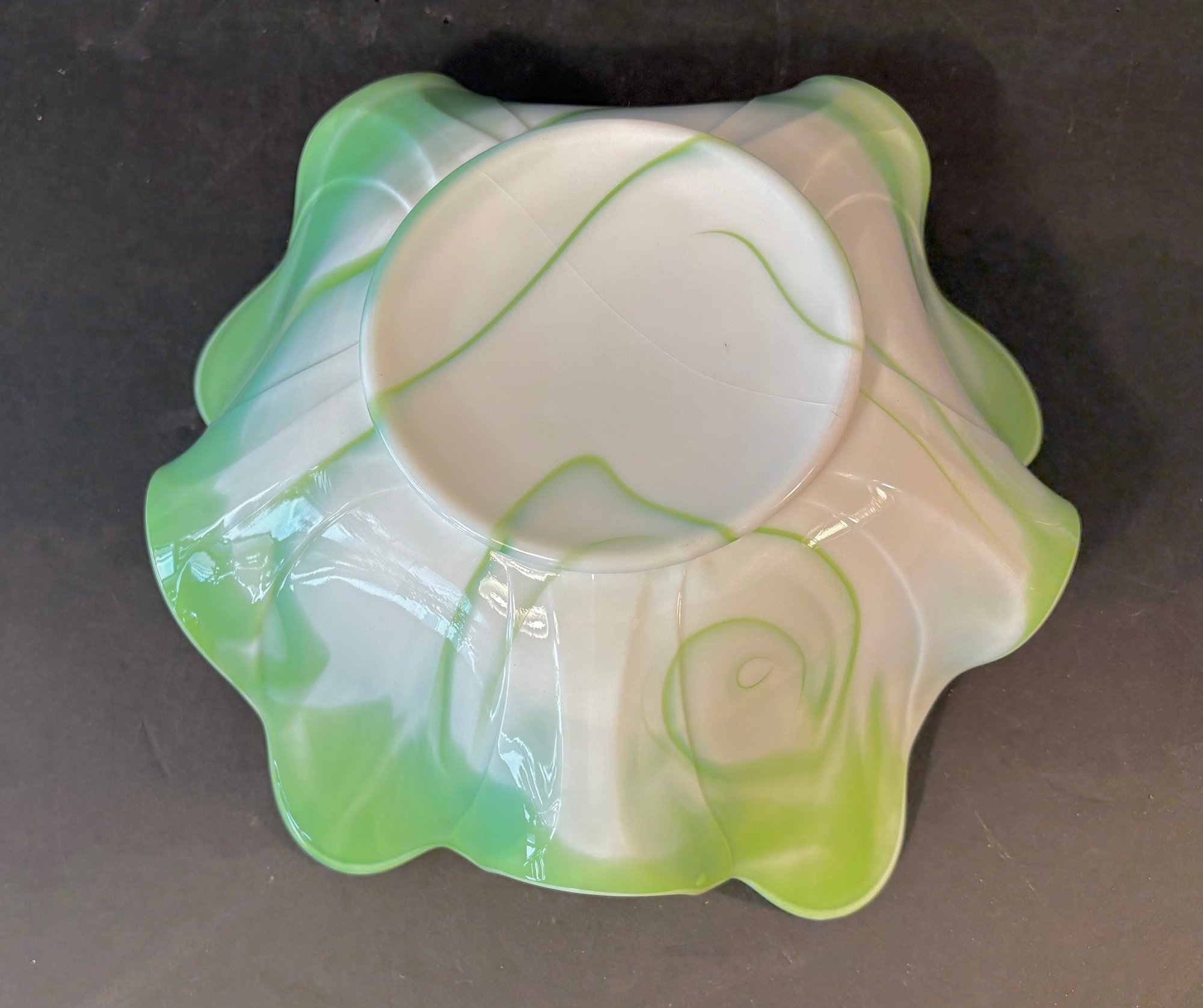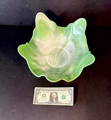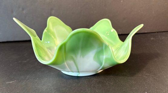 Green and white slag glass bowl, circa 1970.