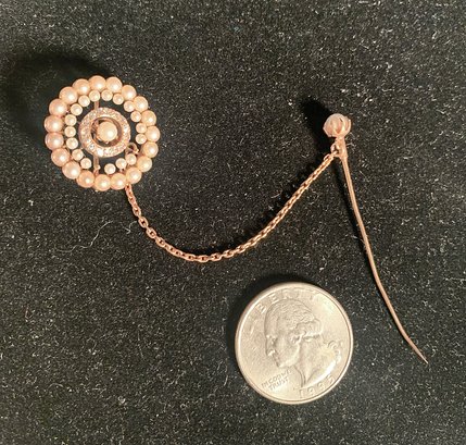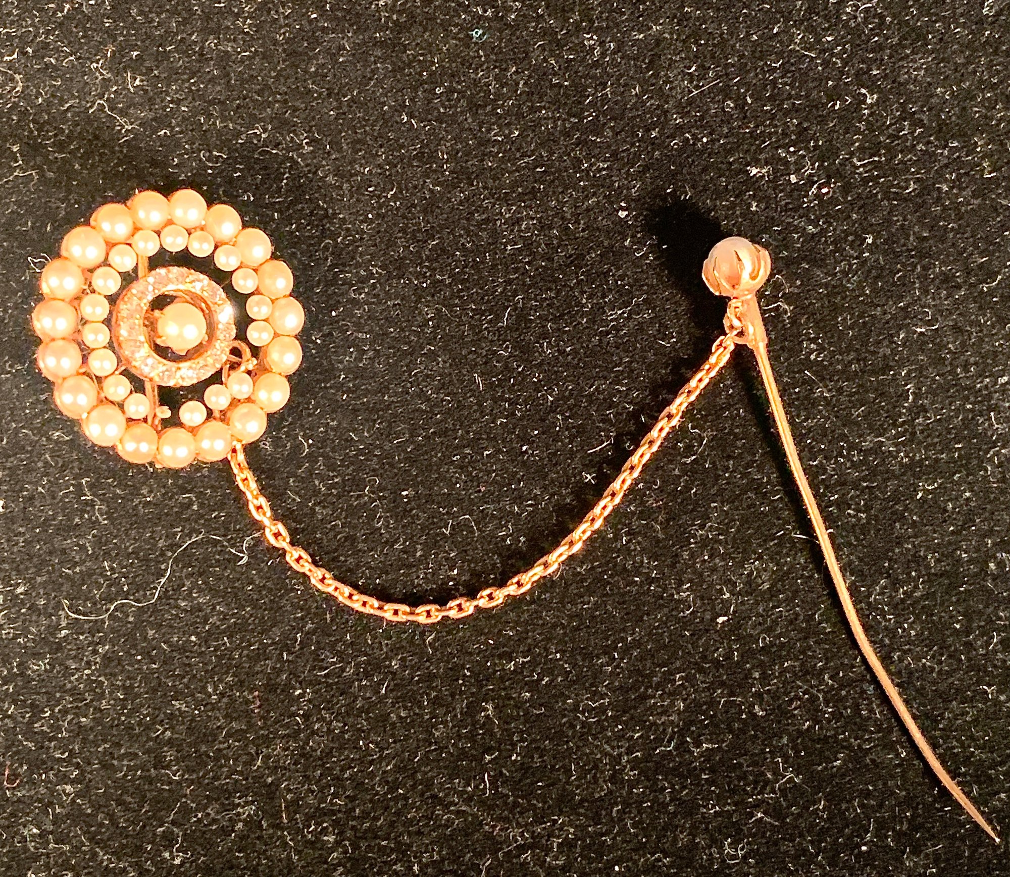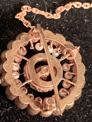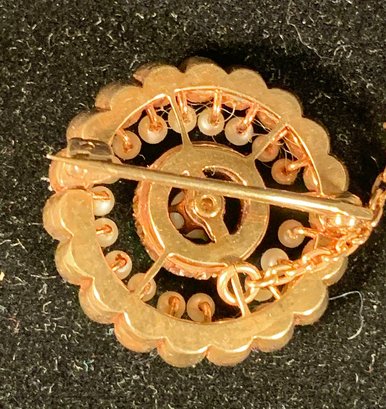 From the 1940 era we are selling a good quality marked 14K Gold brooch. The pearls are in two sizes to emphasize the 12 small diamonds in the center.