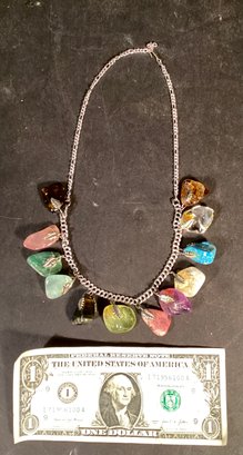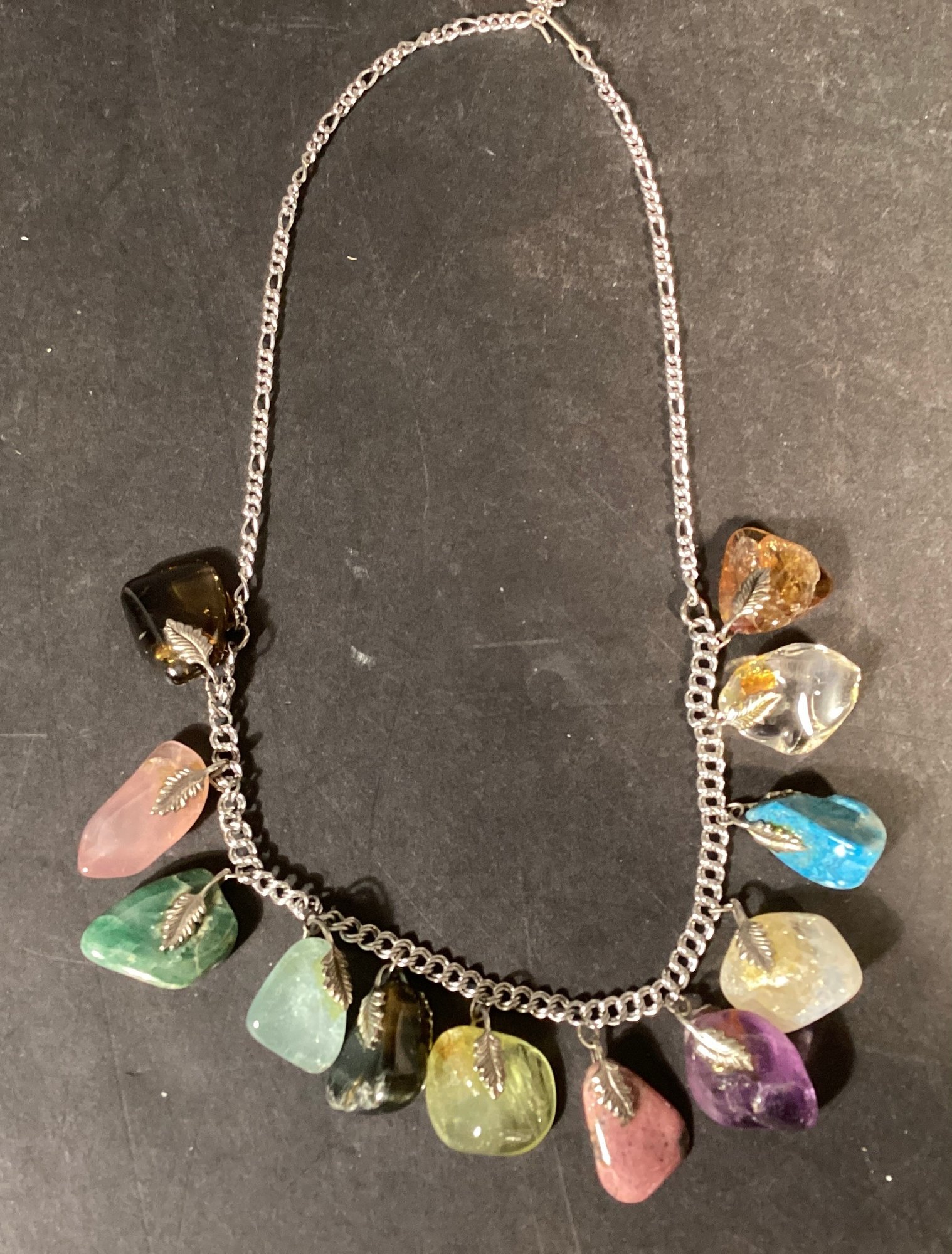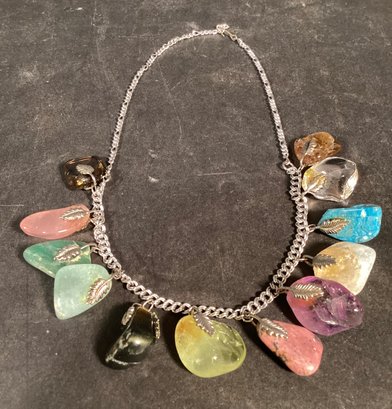 Here is a very nice silver toned necklace that sports 12 polished tumbled stones.