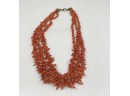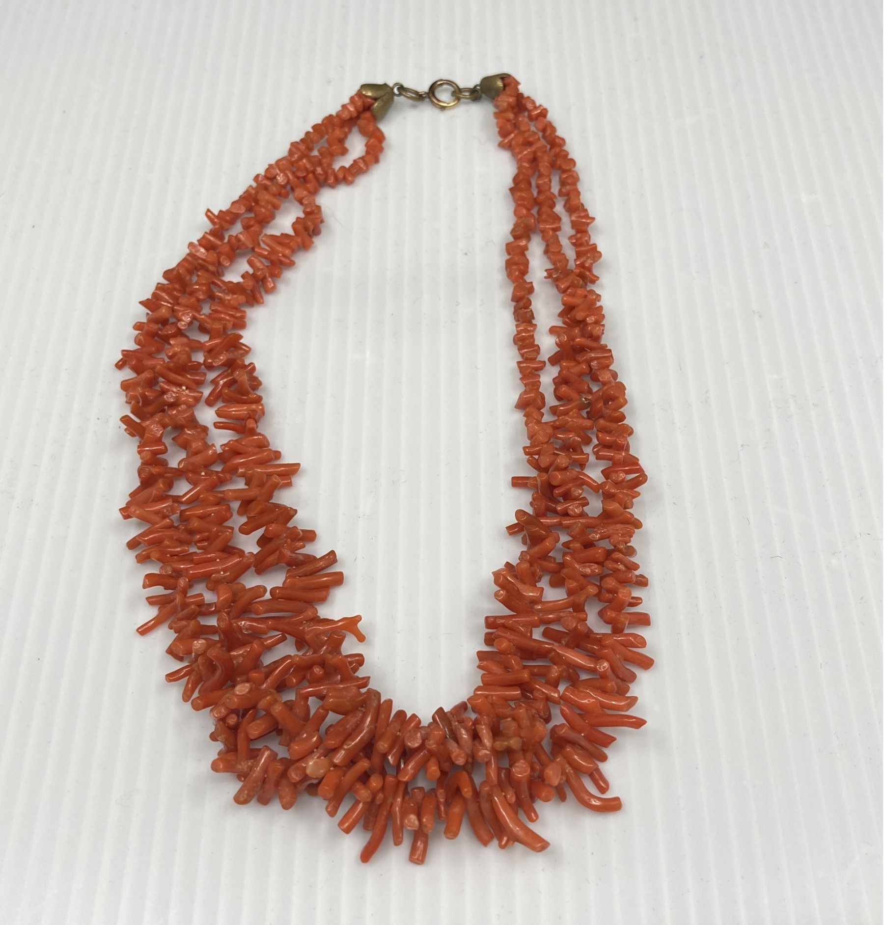 Selling a vintage natural coral necklace with 3 strings. Has brass hardware. C. 1940-1950s.