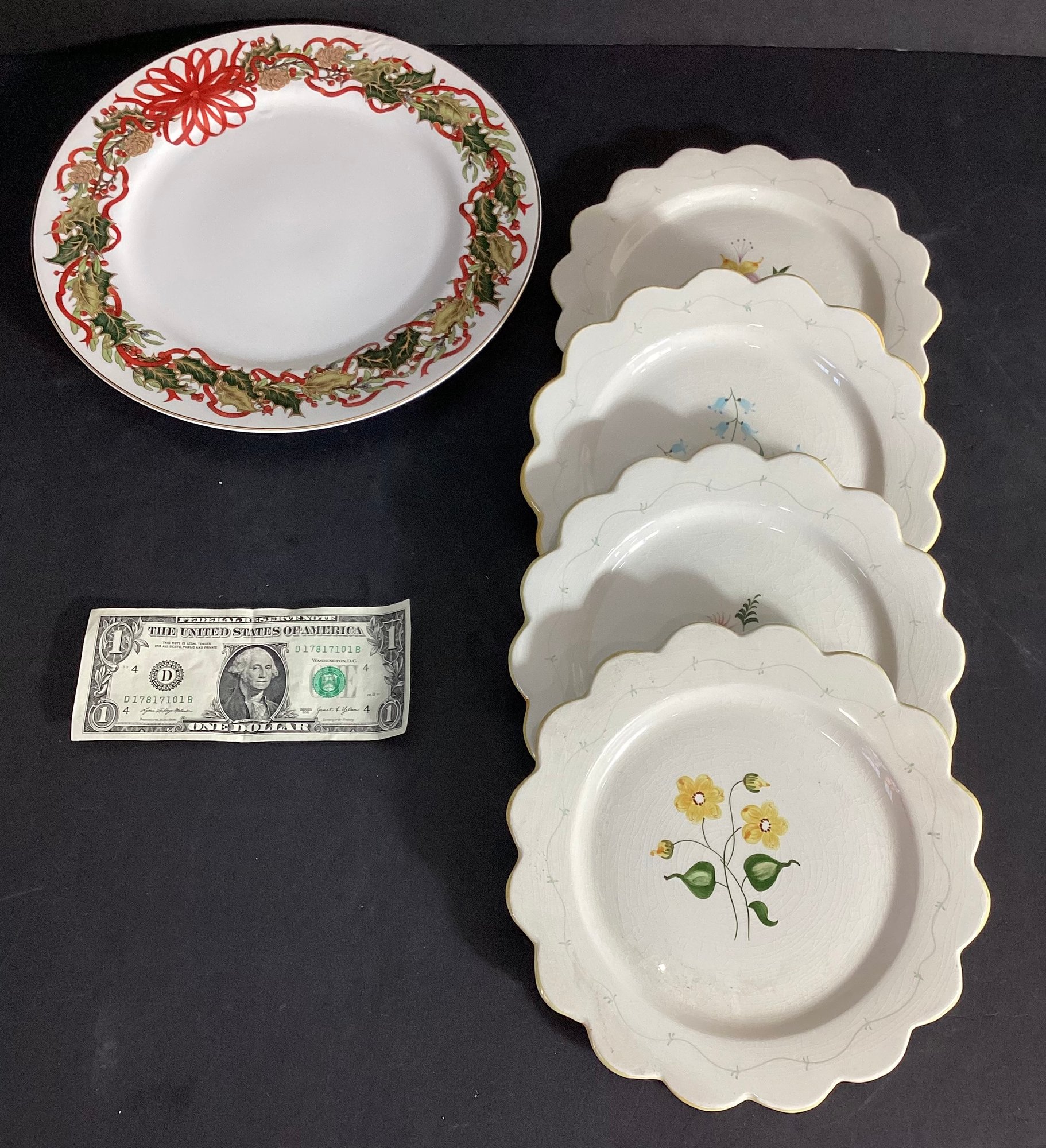 This dish is made of white porcelain with a holiday theme around the outer plate in gold, green, and red. This dish measures approximately 14.00”inches in diameter, and would look great as a cookie presentation dish.